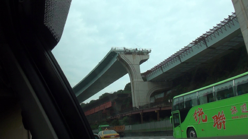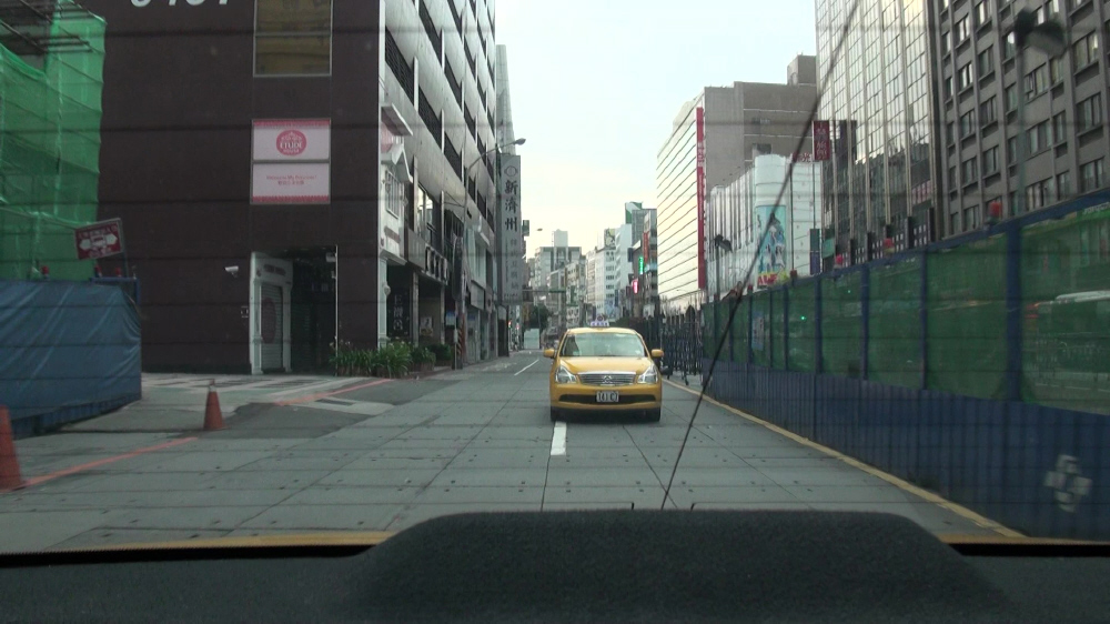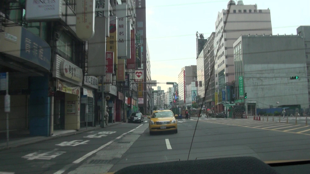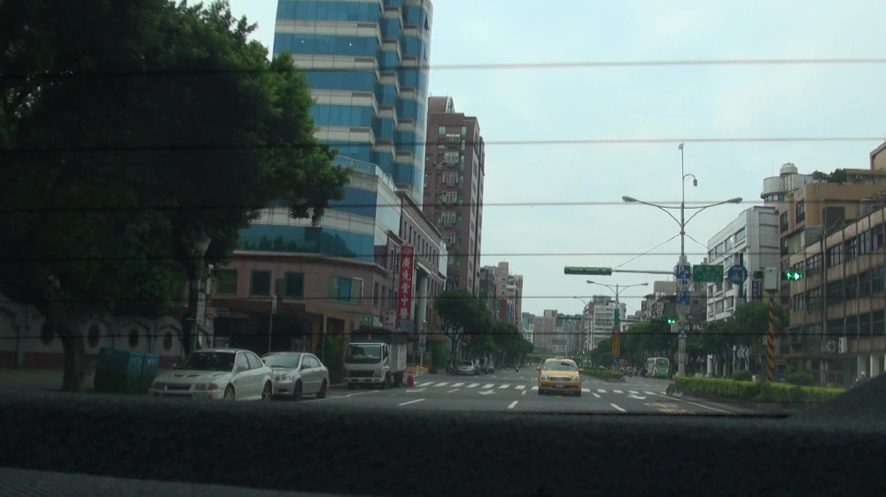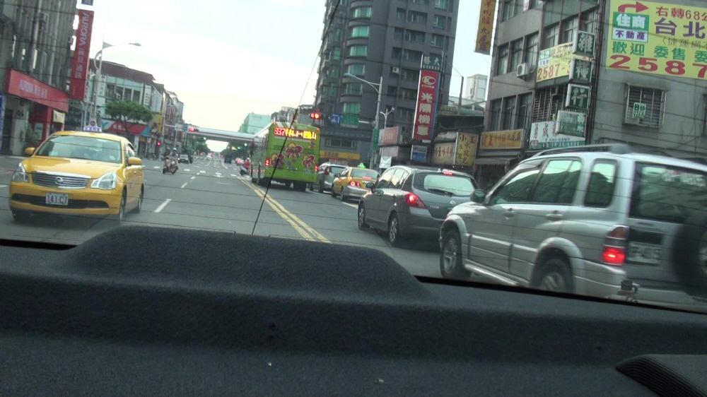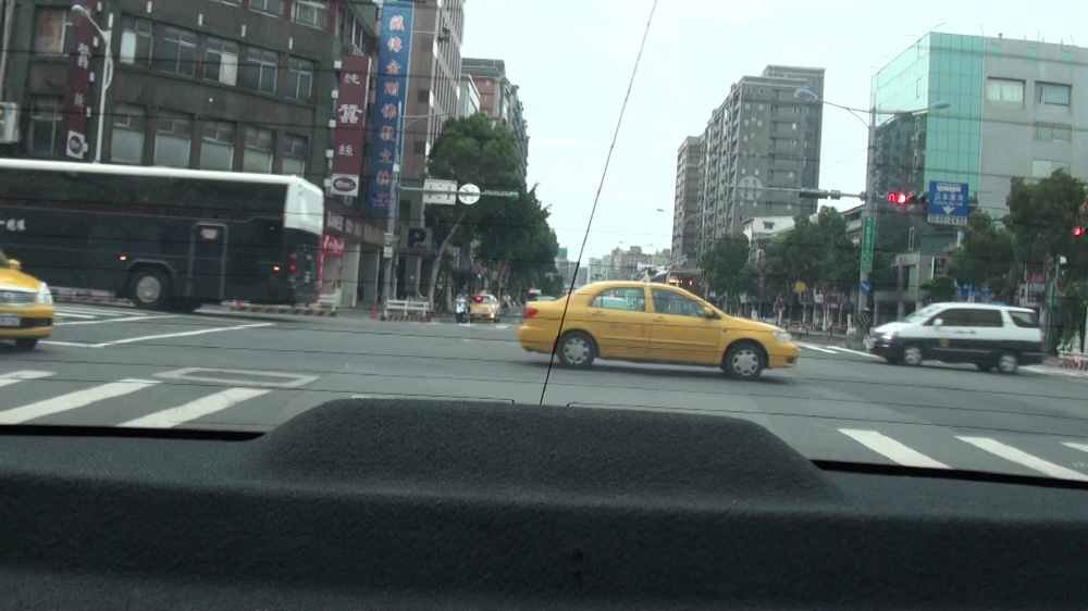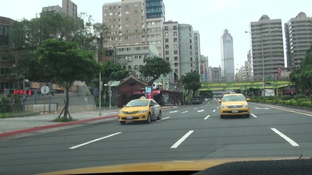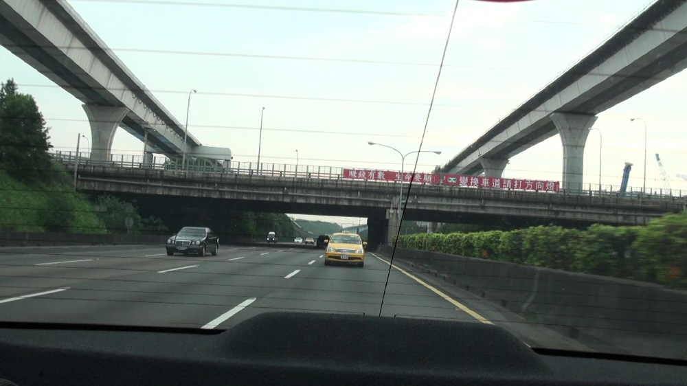 | 成田から一度臺北松山機場に下りる。トランジェントの時間があったのでタクシーで市内観光をする。工事中の高速道路沿いを走っていると交差する道路の欄干に「●錢有數 生命要願 變換車道請打方向燈」の横断幕が見えた。車線変更時はウインカーを出しましょうの意味らしい。市内に入ると「新済州」「●威名品」等の看板を眺めながら車窓の景色を楽しむ。 |