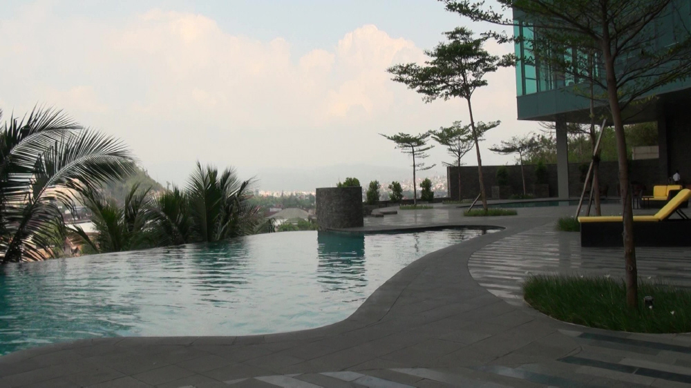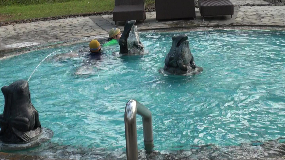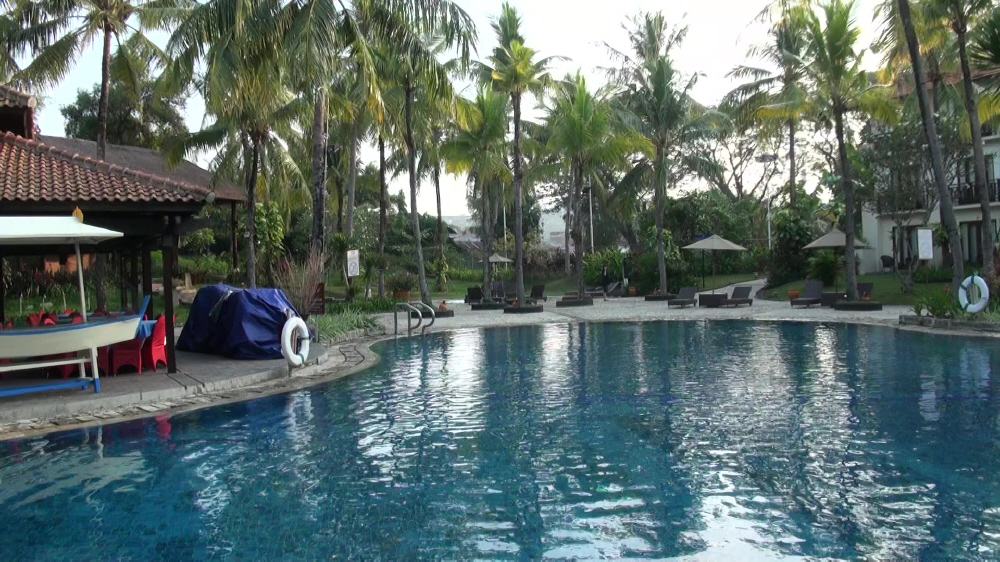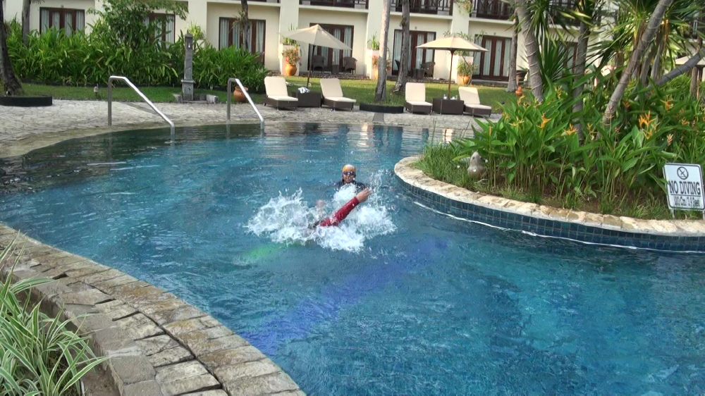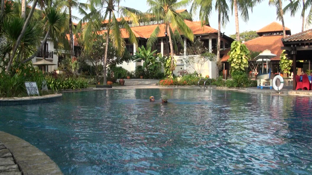 | インドネシアランプン州のリゾートホテルに着いて、早速、プールで泳ぐ。 |
