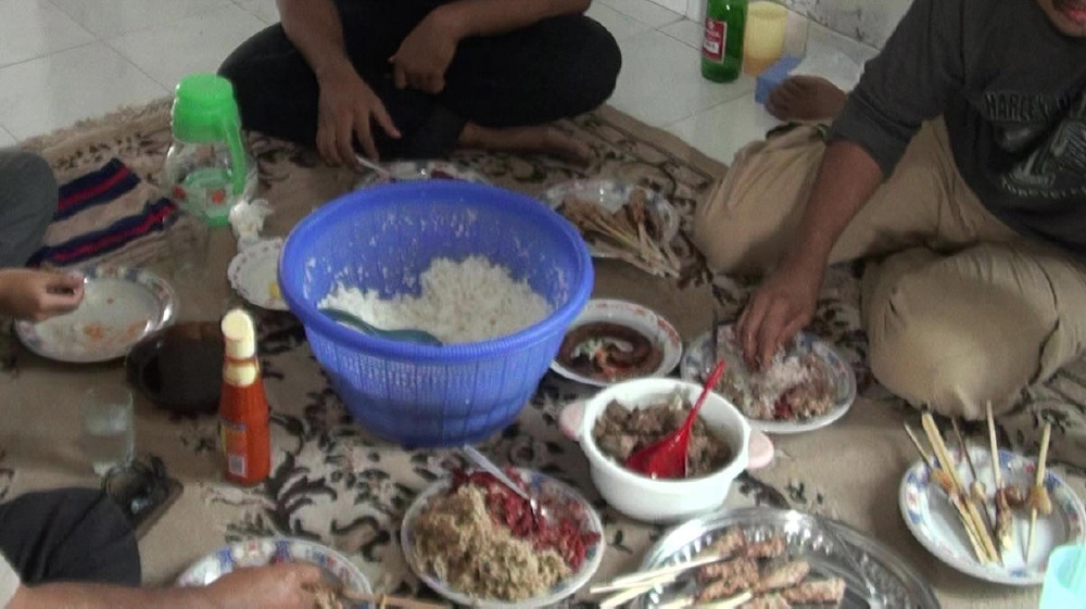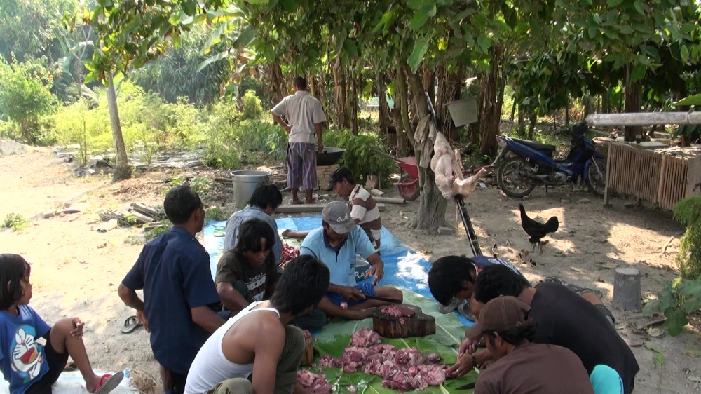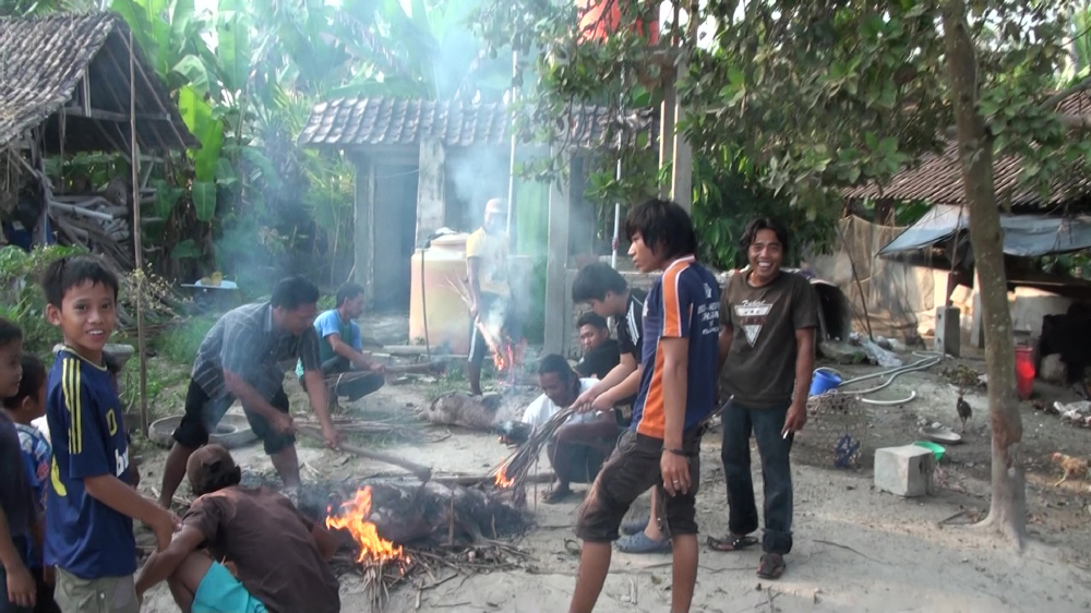| 次の日に、村中で行う数年に一回の葬儀を体験する。ブタの皮を剥ぎ取り易くするのか、タイマツ状の物で体毛を焼いて、鍬で?ぎ取っていた。料理の下ごしらえする人や肉を臼と杵でミンチにする人、肉を切り分ける人と分業で行っていた。 |