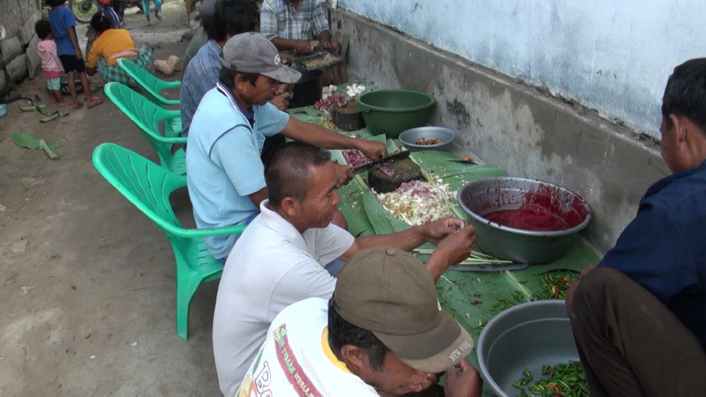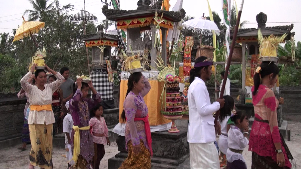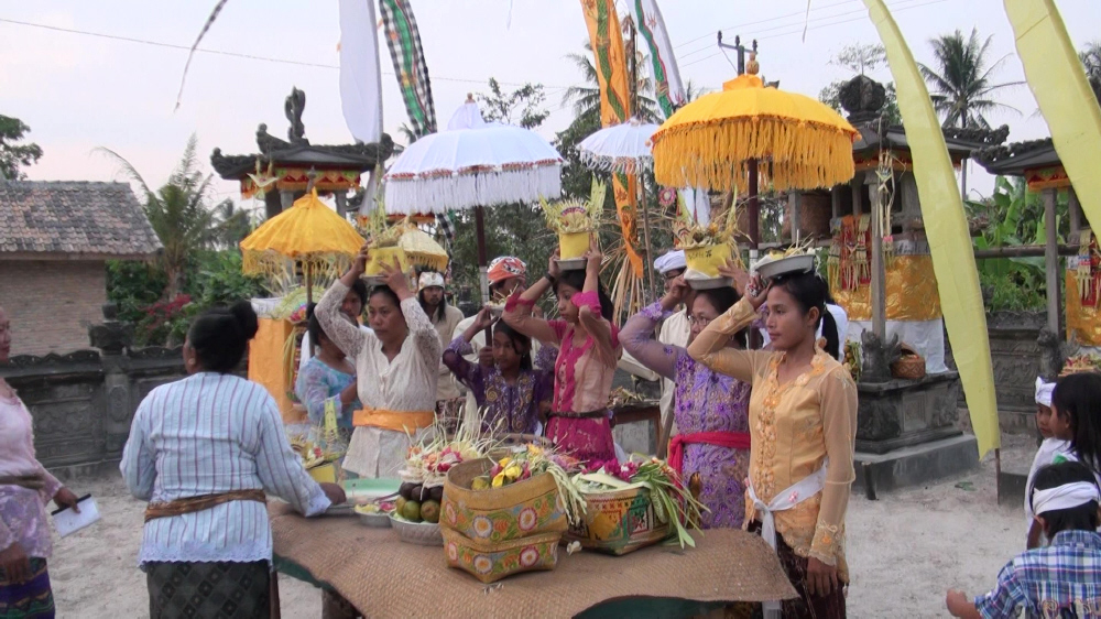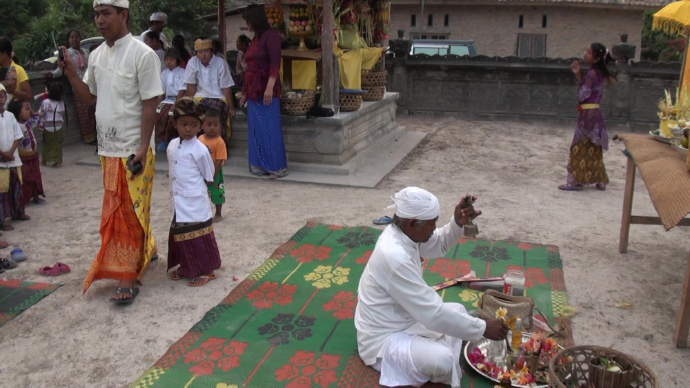 | 丸二日準備の後、正装した村人が寺院に集まり、バリヒンズー教の儀式が始まる。お坊さんは左手にリン、右手で聖水を振りまいていた。中央には供物が置かれていた。 |