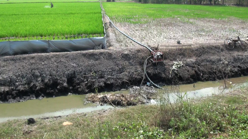 | 木陰では、丸焼きにするブタが串刺しになっていた。時間が出来たので、三輪バイクVIARに乗って圃場を見に行く。三輪バイクVIARは小型の農業用トレーラとバイクを合体させた作業車になる。未舗装の農道を揺られながら辿って行く。水田の灌漑ポンプがあり、農作業をしていた。 |