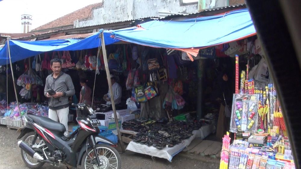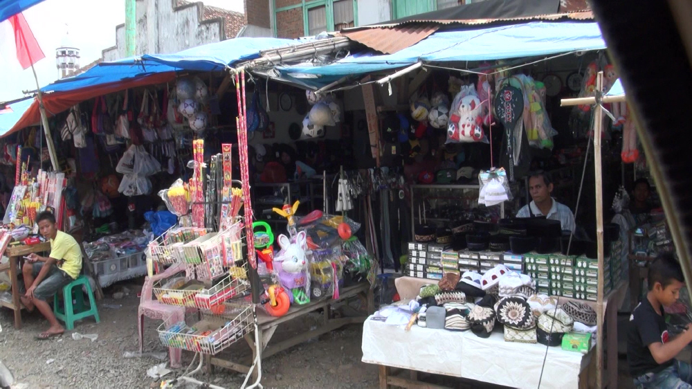 | 露店の市場にはいろいろな店が軒を連ねていた。 |