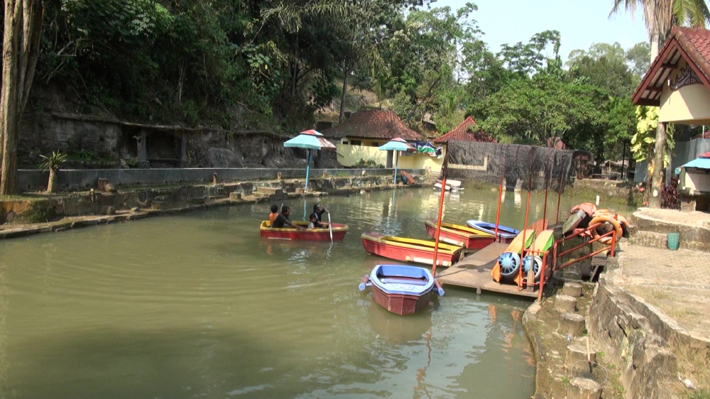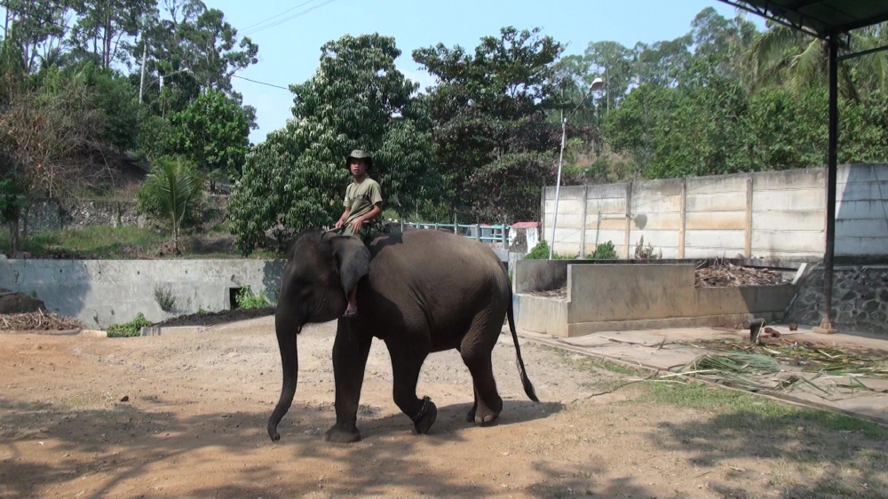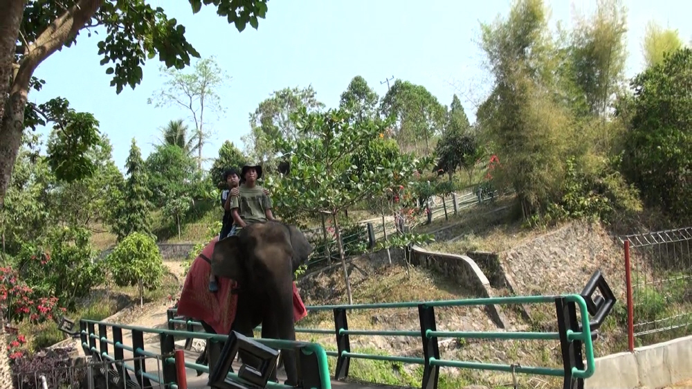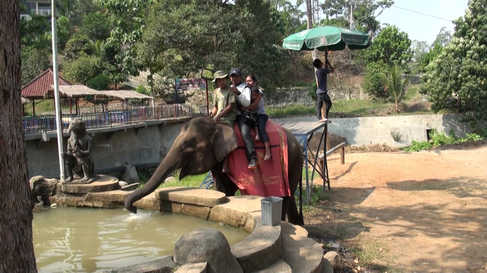 | 「ガネーシャ(Ganesha)」の像の鎮座する水飲み場で、最初に像が水を飲み、ゆっくり園内を回る。園内には看板「BANK LAMPUNG」や看板「SELAMAT DATANG DI ARENA GAJAH/BUMI KEDATON RESORT(エレファントアリーナへようこそ)/Bumi Kedaton Resort(ブミ・クダトン・リゾート)/Atraksi Gajah(象のショー) Safari Malam(夜のサファリ)/Tunggang Gajah(象乗り体験) Foto Bersama Gajah(象との記念撮影)」がある。日本から来たことが分かったら、子供達には橋を渡って遠回りをしてくれた。 |
