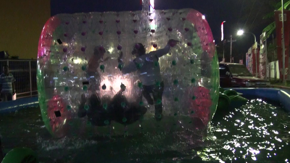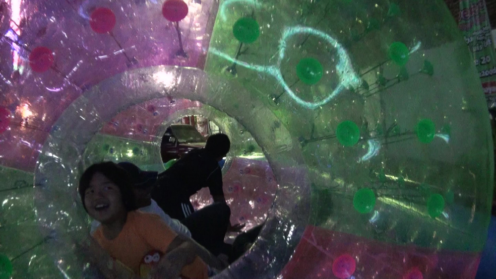 | ボートはオールではなく、左右の漕ぎ手がパドルを漕いで進む。食事を食べ終えて、ウォーターローラー(Water Roller)で遊ぶ。 |