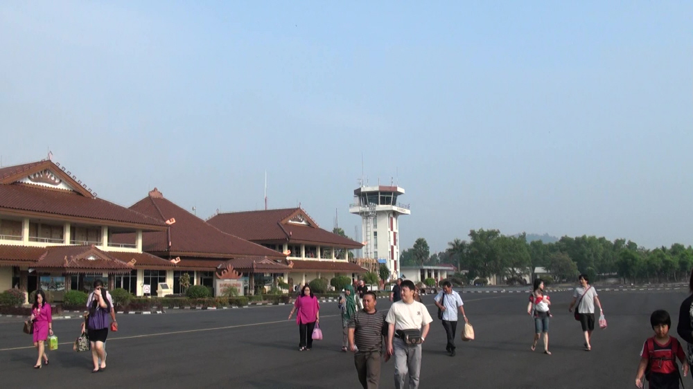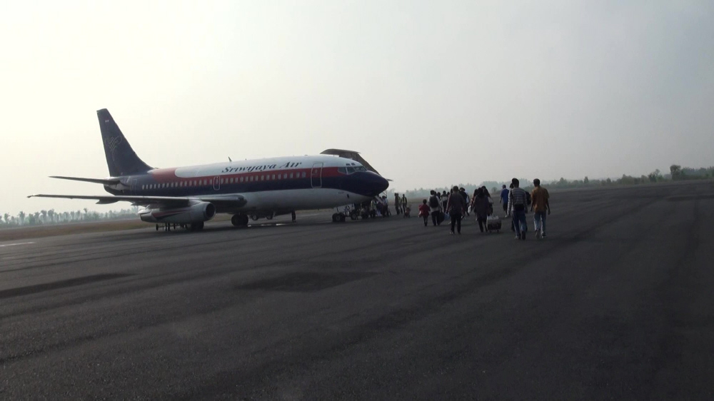 | Bandar Lampung(バンダールランプン)市のRadin Inten II Airport(ラディン・インテンII空港)でSriwijaya Air(スリウィジャヤ航空)のボーイング737型機にタラップを使って乗る。 |