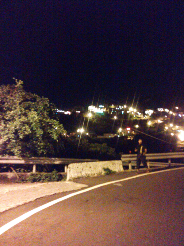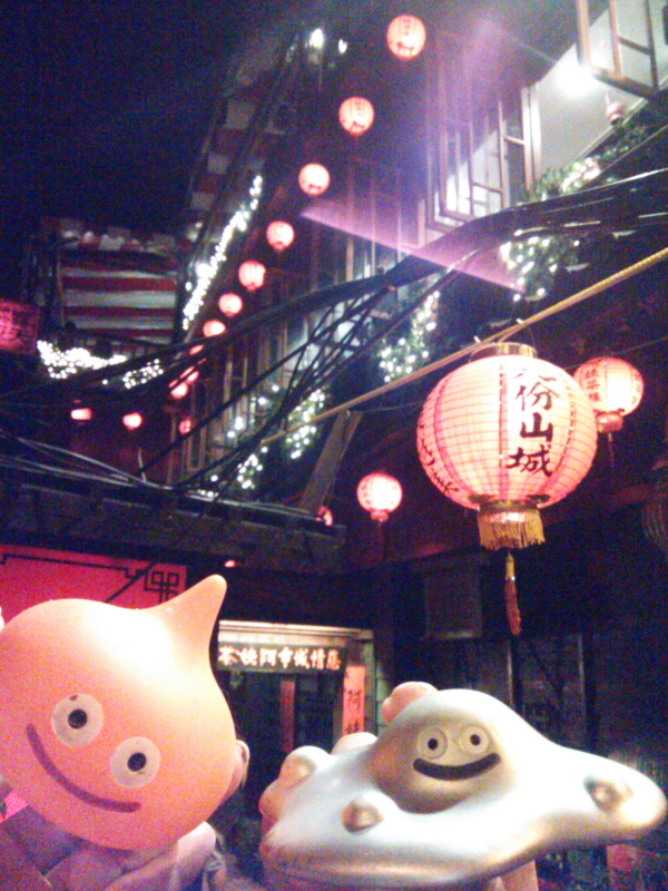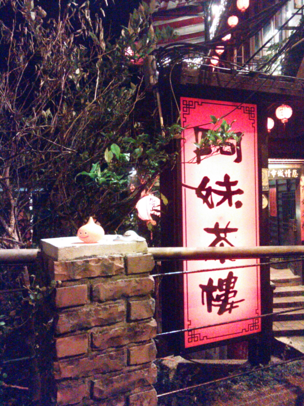 | 「阿妹茶樓(Å mei cha lou:アーメイ茶楼」の看板と「九イ分山城」の提灯、工夫、夜景を見ながら楽しむ。 |