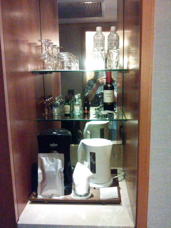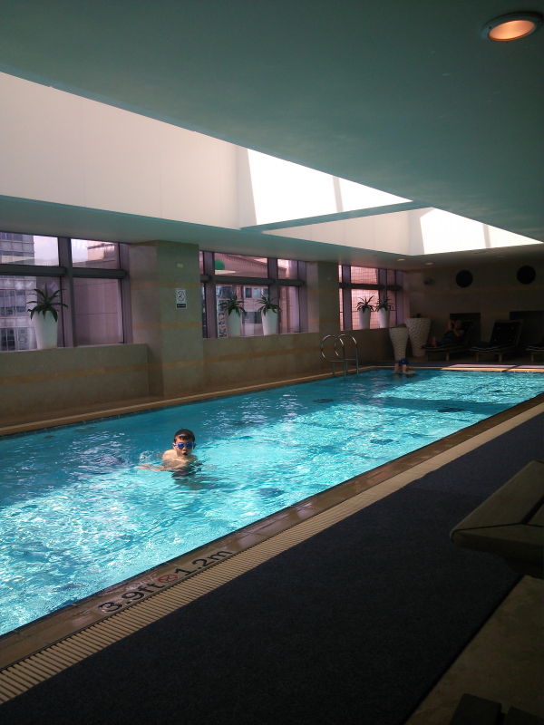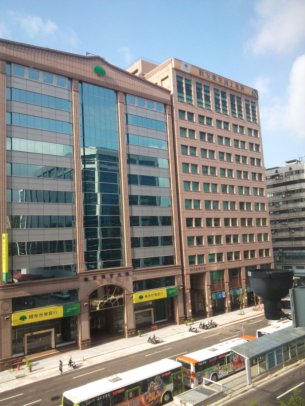| HOTEL METROPOLITANの窓から外を見ると、國泰世華銀行(Cathay United Bank)、新安東京海上産(立が文)險のビルが見える。ホテルの朝食はバイキングスタイル。食後はホテルのプールで泳いで遊ぶ。 |