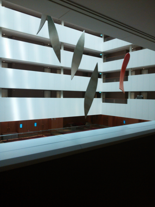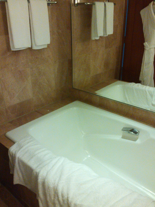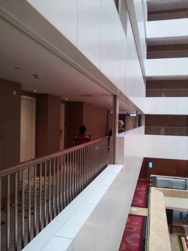 | アトリウム式廊下からバスルーム、ベッド、備品とホテルの中を記念に写す。 |