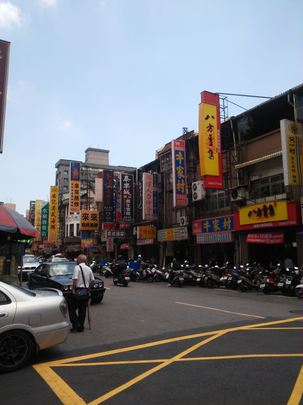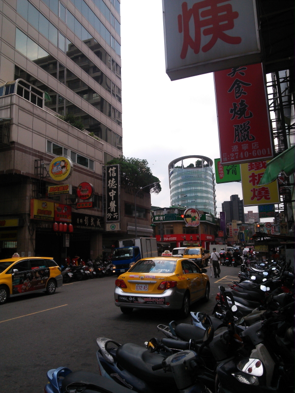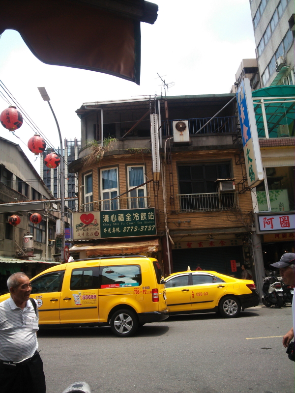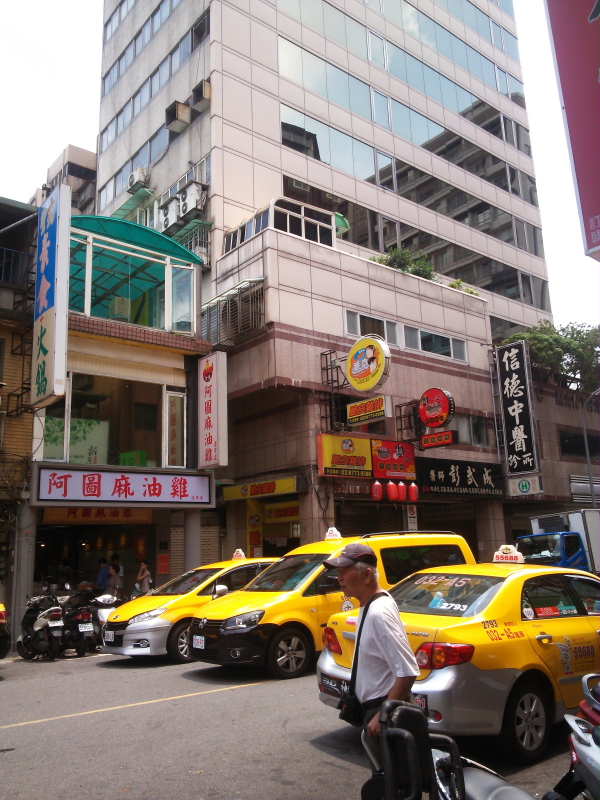 | 雑居ビルには、「信徳中醫診所」「醫師彭弐成」「排難皮脆」「克派Two Pock」「阿圖麻油鶏遼寧店」「清心福全冷飲站など中國華語の看板、台湾大車隊の黄色いタクシー、が台湾らしい。街角には小吃店(シャオツー店)があり、入口の看板にメニューの写真と$の価格が表示されていた。価格は台湾ドル(TWD/ニュー台湾ドル)表示だった。 |