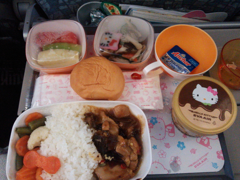 | 臺灣桃園國際機場から遠くの山並みが見えるが、名前までは同定出来なかった。途中で機内食が出てきた。 |