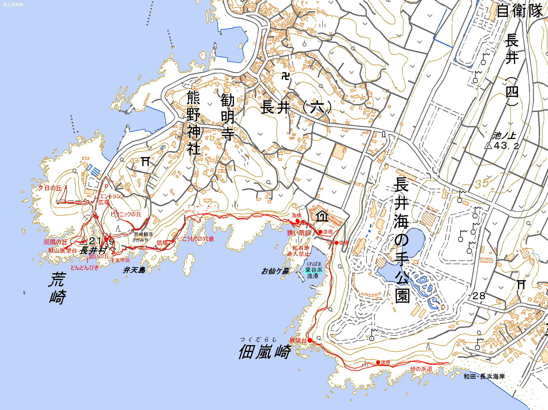 ポイント 公園駐車場の奥にあるエントランス広場から、。ピクニックの丘、夕日の丘、潮風の丘(城山展望台)、憩いの丘に行ける。ピクニックの丘は展望が無いが、他の丘からはリアス式海岸が見え、対岸には富士山が薄っすらみえていた。憩いの丘からリアス式海岸シーサイドコースを辿ると、十文字洞、弁天島、こうもり穴倉が見られる。佃嵐崎の展望台も展望は良く荒崎を一望できる。和田・長浜海岸に入ると砂の浜道になる。 |