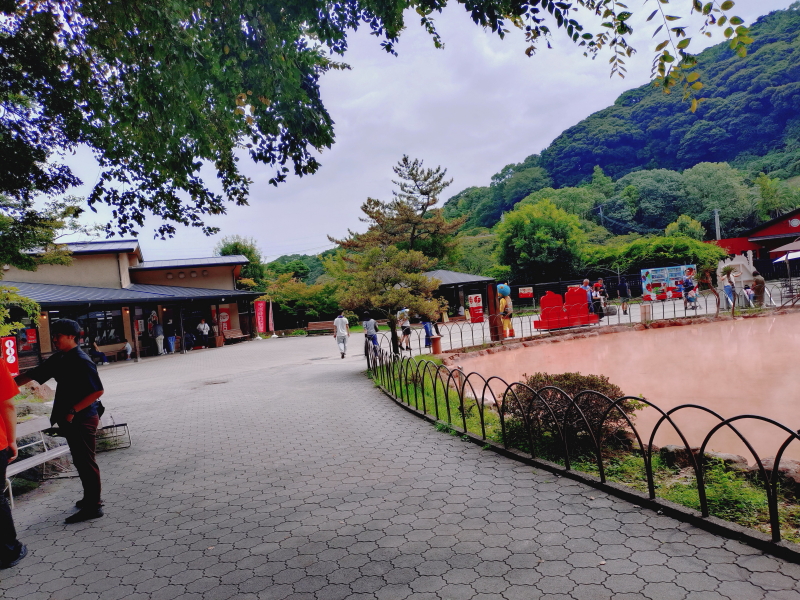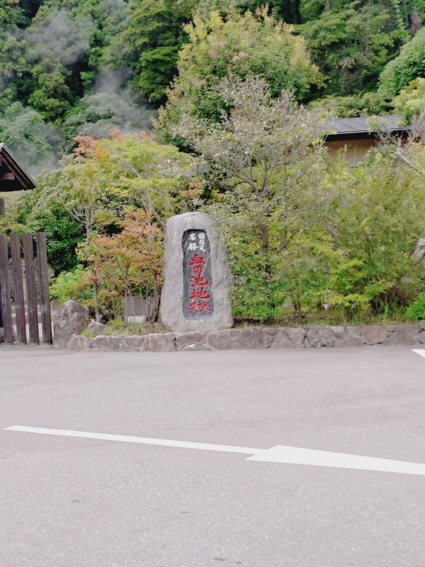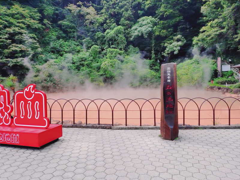 | 血の池地獄の駐車場から石碑を眺めながら入口に行く。赤鬼の門番の居る門を潜って中に入る。入口で大人2000円の入場料を払って中に入る。売店を通って血の池地獄へ出る。 |