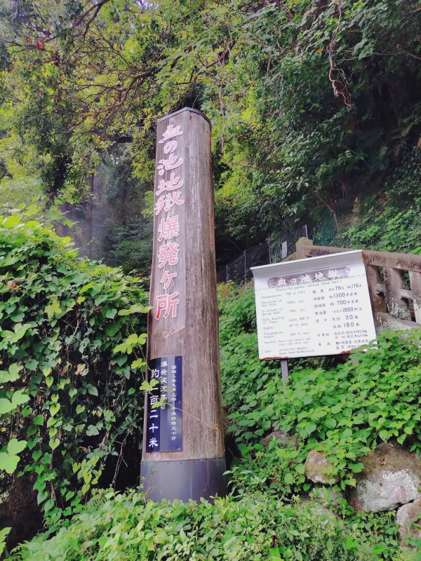 | 血の池周辺を見て回ると、爆発ヶ所の標柱や歌碑「自ら/早紅葉したる/池畔かな/虚子(大正9年8月)」がある。 |