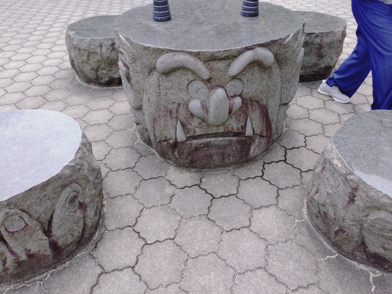 | 虚子流に言えば、紅葉した池の回りを回る。熱血の看板と記念写真を写す。回りには石の鬼の顔をした椅子もある。 |