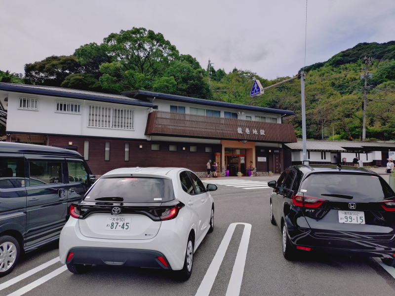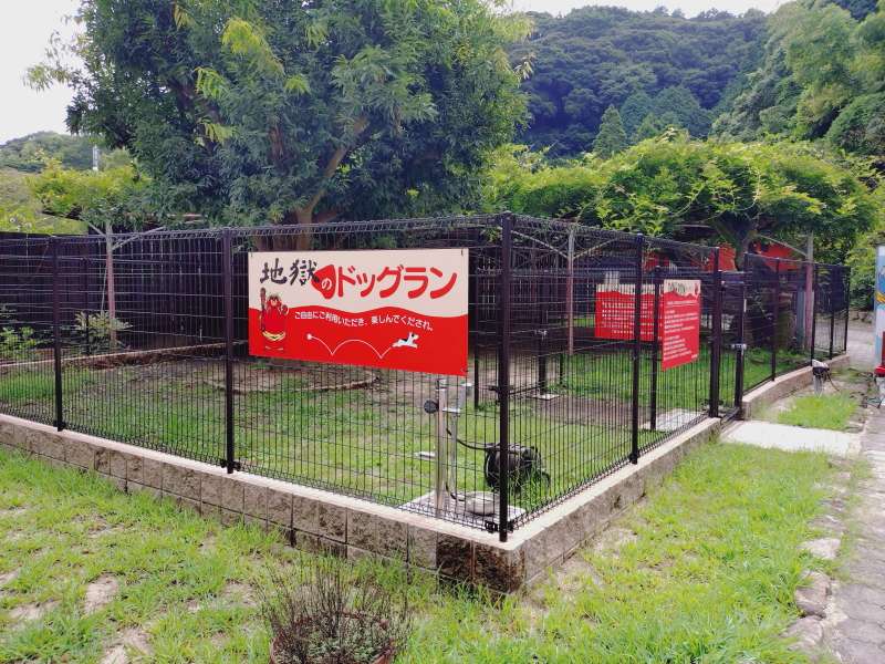 | ドックランも整備されている。停留所の看板も角のある鬼の形をしていた。龍巻地獄駐車場に下りると、駐車場や看板がある。 |