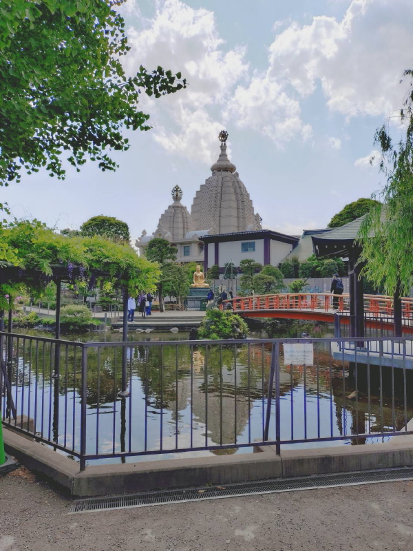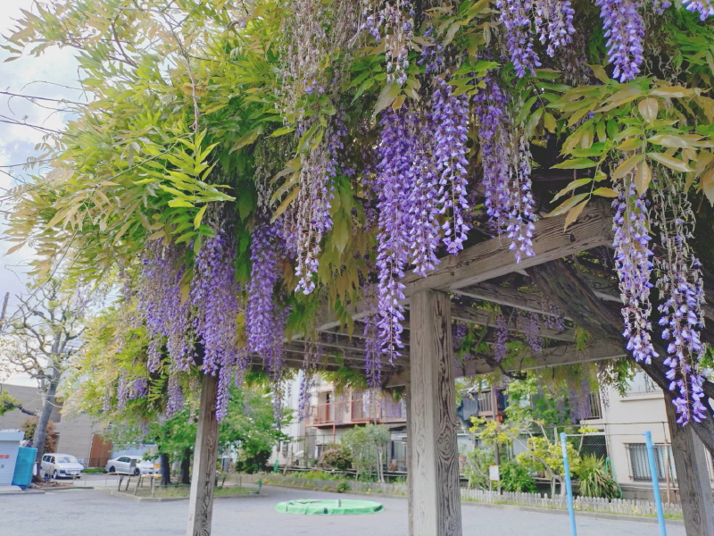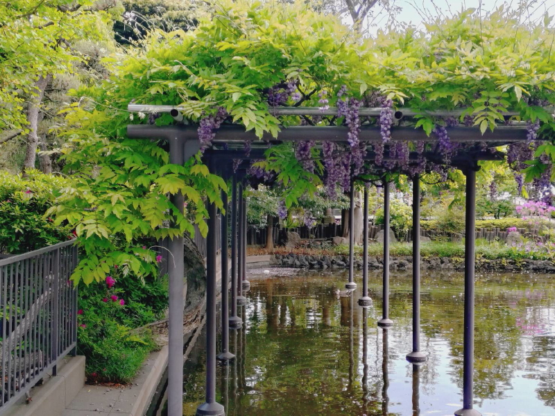 つるの池越しに薬師殿とやすらぎの橋が見えていた。池の中には藤棚があり、フジの花が垂れ下がっていた。 |