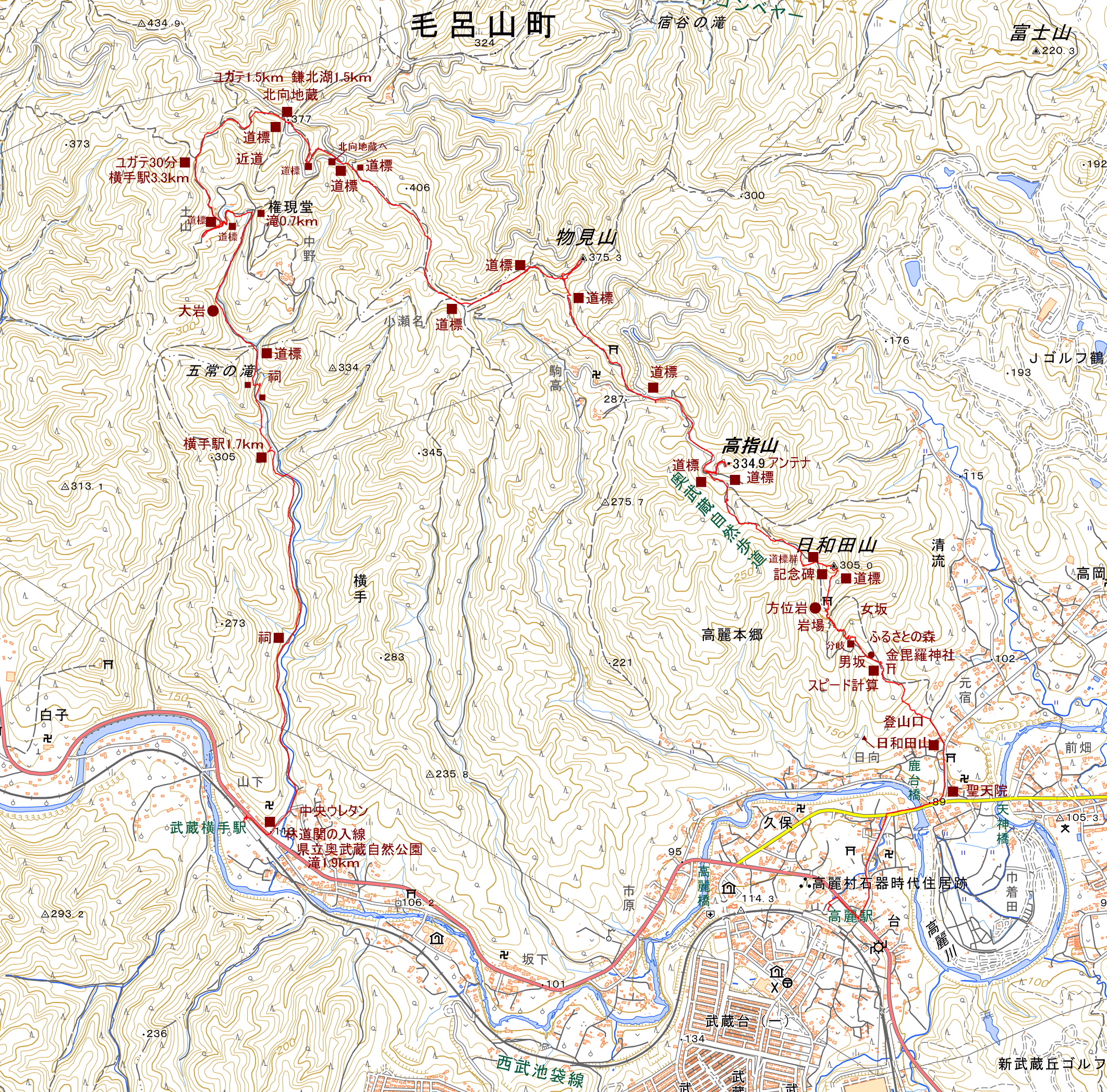 | 日和田山(305.0m)高指山(313m)物見山(375.3m) 五常の滝(210m) |