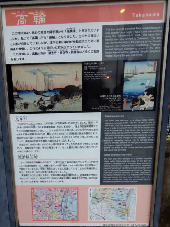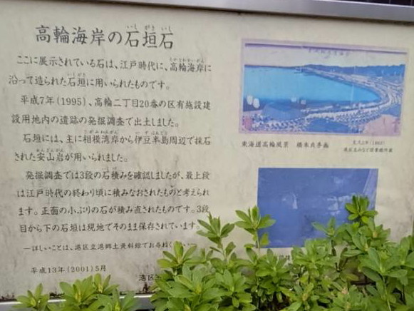 高輪海岸の石垣と同じ小緑地にある。解説板は東京都港区ホームページ「高輪地区旧町名由来板 高輪公園」に奇麗な形で載っている。 |