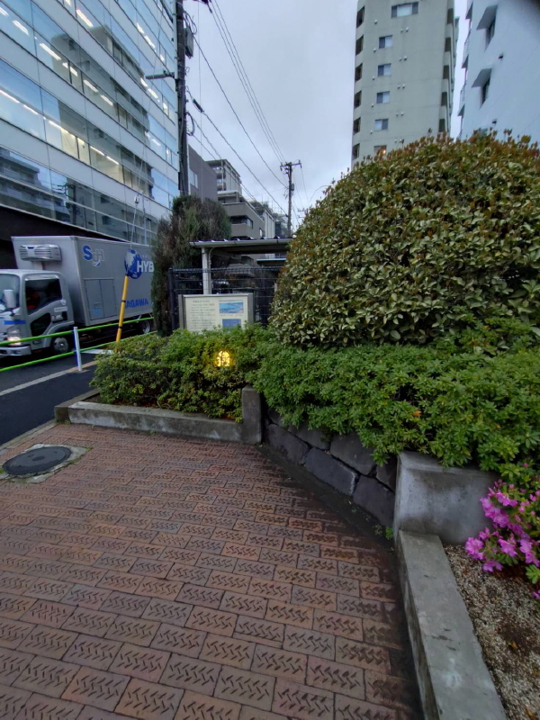 高輪ゲートウェイ駅の南西で、桂坂と国道15号線が交わる交差点の信号「高輪二丁目」の北西角に小さな緑地がありその一角に石垣がある。石垣に添えて解説板もある。 緑地は区営シティハイツ桂坂都営トミンハイム桂坂の敷地のようだ。 |