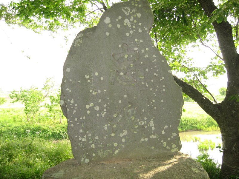 | 筑波山の帰り道、国道125号線を走っていると娘が見つけた「小田城跡」の道標に導かれて、小田市街に入る。市街地の塀には地図が掲げられているが、道が分からない。地元の方が自転車で通りかかったので、聞いて見ると丁寧に教えてくれた。自転車で先導してくれるとも言うが、自力で行くことにする。教えられた通りに、道を辿ると、先程のご婦人がにこにこと笑いながら自転車で近づいてきた。もう直ぐらしく、再びお礼を言って小田城跡を目指す。 看板のある原っぱで道は終わっていたので、下りて看板を見る。確かに小田城跡で、小田城跡は西側の森の中のようだ。近づいて行くと、忠魂碑が現れる。カタカナで書かれているので戦前のようだ。 |