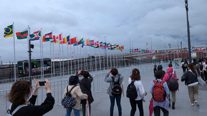 | はためく万国旗を横目で見ながら東ゲートに向かう。 |