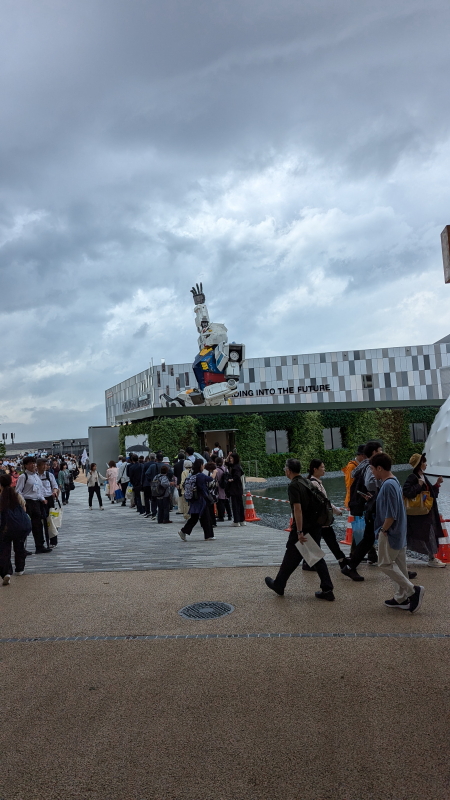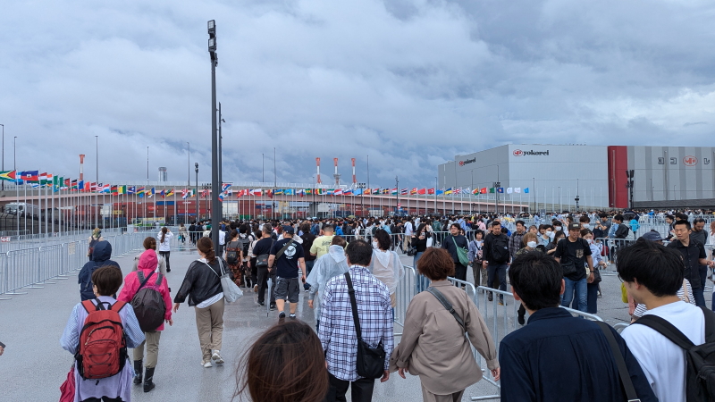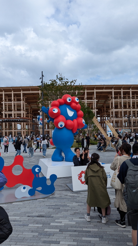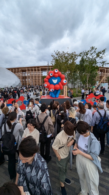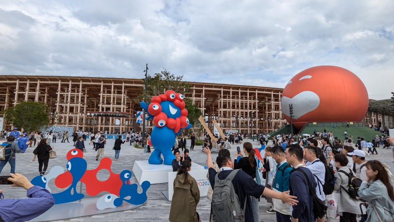 | 東ゲートは入場者で大渋滞だった。ようやく東ゲートを潜ると大屋根リング、ミャクミャクモニュメント、住友館、電力館が見えて来る。 |