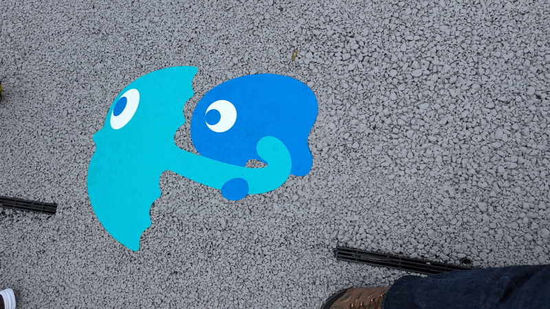 | 大屋根リングのエスカレーターの横には可愛い絵が描かれていた。一回目のトイレタイムの後、関西パビリオンに戻る。関西パビリオンに入ると、飯田グループホールディングスと大阪公立大学の映像が壁に投影さらていた。その壁に入口があり入って行くと人工光合の展示があった。 |