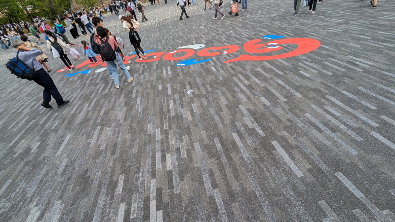 | 中庭に入ると、ミャクミャクハウスを発見する。ミャクミャクハウスは長蛇の列だったのでパスする。アラブ首長国連邦館はナツメヤシの木を思わせる柱と、近代的な画面が印象的だった。ミャクミャク絵柄のマンホールを眺めながら歩く。 |