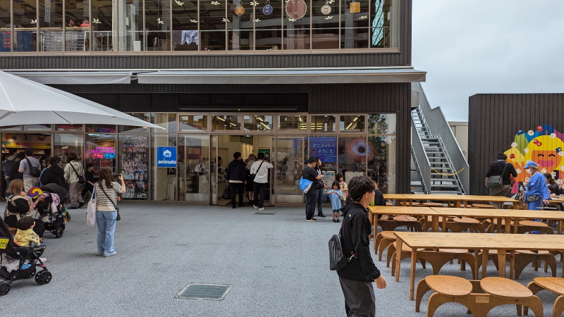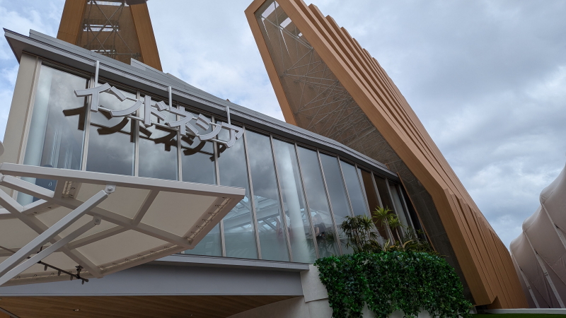 | ウエルネススマートシティーを上から眺める。アニメイト前を通り、インドネシア館に向かうが、なにわ黒和牛串の匂いの誘惑に負け、キッチンカーで舌鼓を打つ。インドネシア館に向かうと、入館者が並んでいた。 |