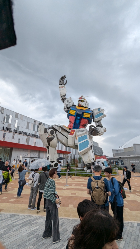| 廊下に出ると、壁に影絵人形が飾ってある。カフェもあるので、早速、バクソ・クア肉団子と牛骨スープにあり付く。再び大屋根リングの18番当たりから外側にでる。西通りにガンダムが高々と手をあげているのが見えた。 |