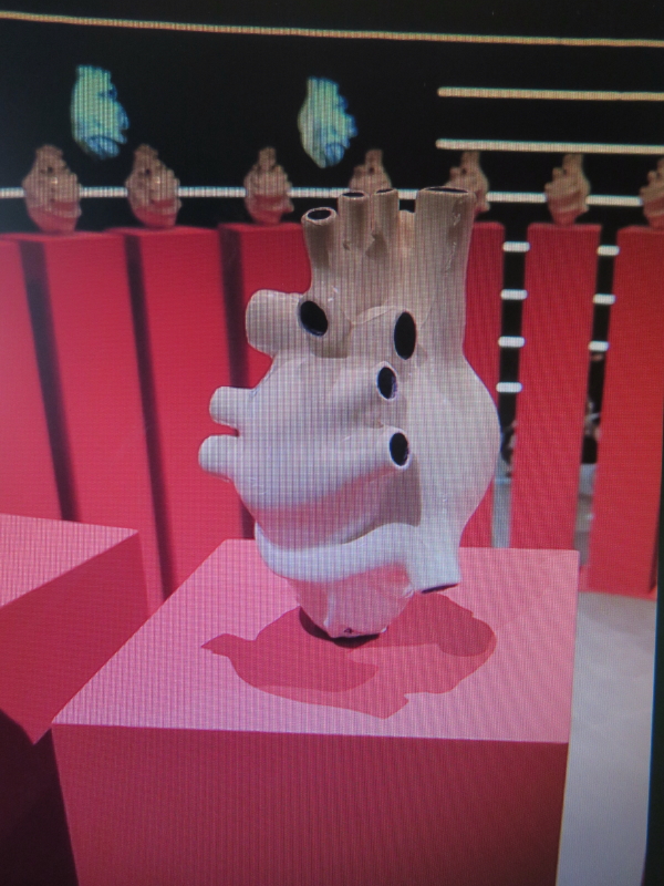 | 今度は、イタリア館に入ることにする。中に入るとスクリーンに映像が映し出される。終わると場内に導かれ中に入ると、30個位の陶器の心臓や伊東マンショの肖像画が展示されていた。 |