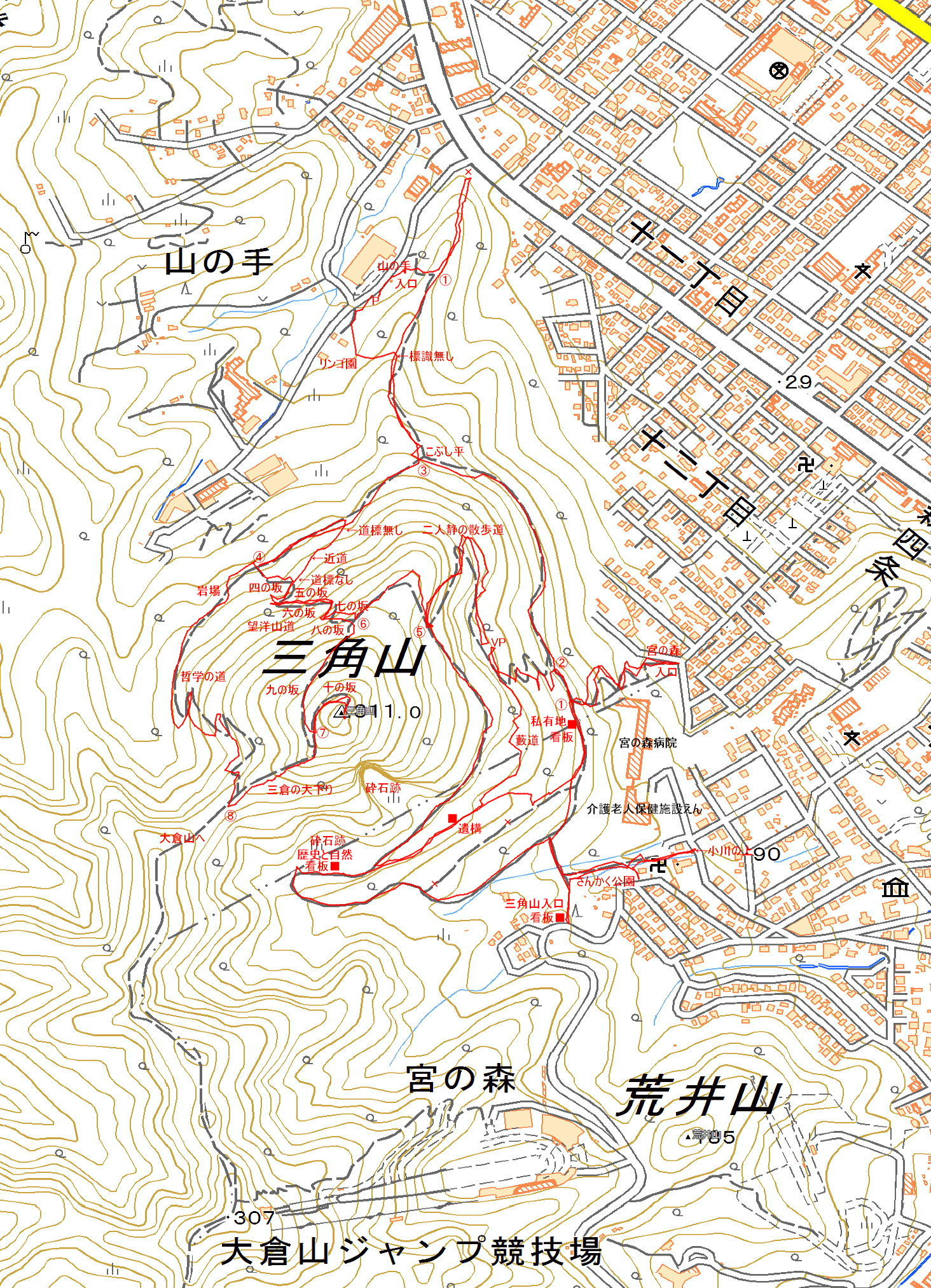 アクセス 北1条宮の沢通沿いに「三角山の散策路入口」の道標があり、山の手入口に着く。他に、宮の森、リンゴ園、荒井山、琴似発寒川支流、さんかく公園にも入口はある。駐車場があるのは山の手入口のみになる。 国土地理院地図 Google Map 登山道地図(2021.11.30)クリック大→┃ |