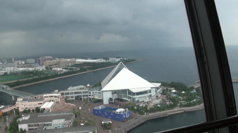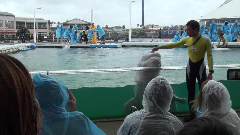 | 最後に西浜桟橋を見下ろして地上に下りる。次に、メリーゴーランドに乗る。フロアにはオットセイが居る中ふれあいラグーンでカッパを着る。ラグーンの傍に行くとイルカが顔を出す。 |