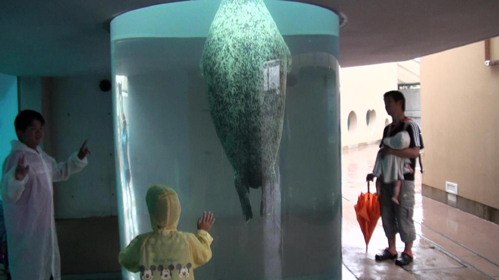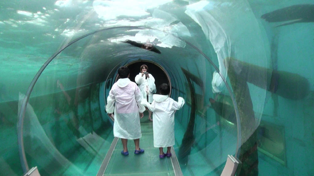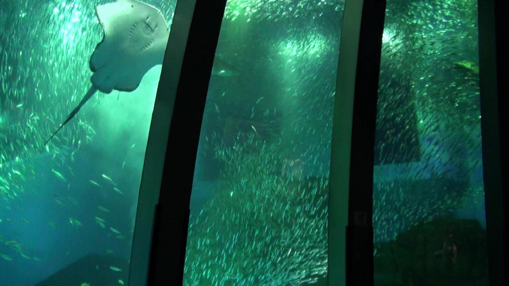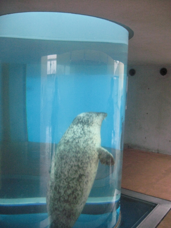 | 餌を見せると大きな口を開けて待っていた。アザラシがアクアチューブの中をゆっくりと下から上へと泳いでいた。水槽の下のアクアトンネルを辿って行くと、頭の上をアザラシ等が通り過ぎる。 |