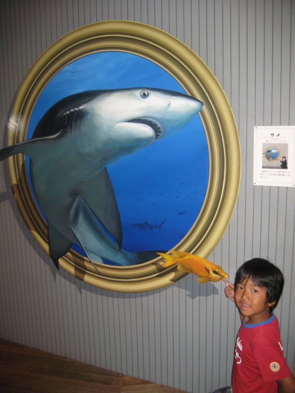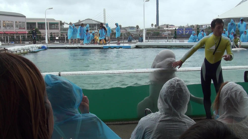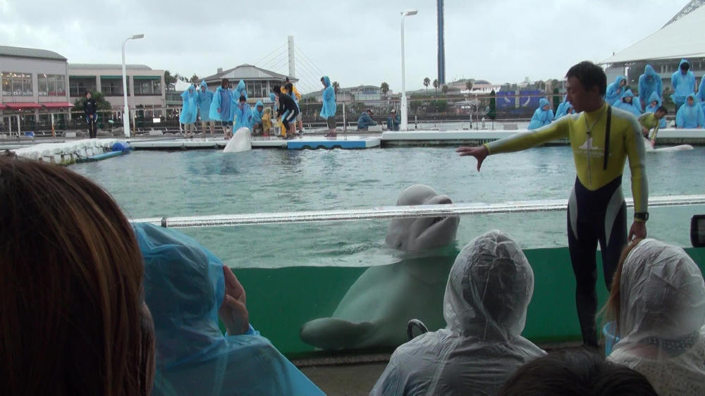 | 水槽の中のアクアトンネルを抜けると白イルカショーの会場だった。白イルカの頭は柔らかく指で押すへこんでしまう。人が回るとイルカも回ったりする。イルカが口から水を吹きかけるとびしょびしょに濡れてしまう。何故かカッパを着ていないご婦人もいて着物が濡れて、着物の端を絞っていた。カッパを着ていない人がイルカ? |