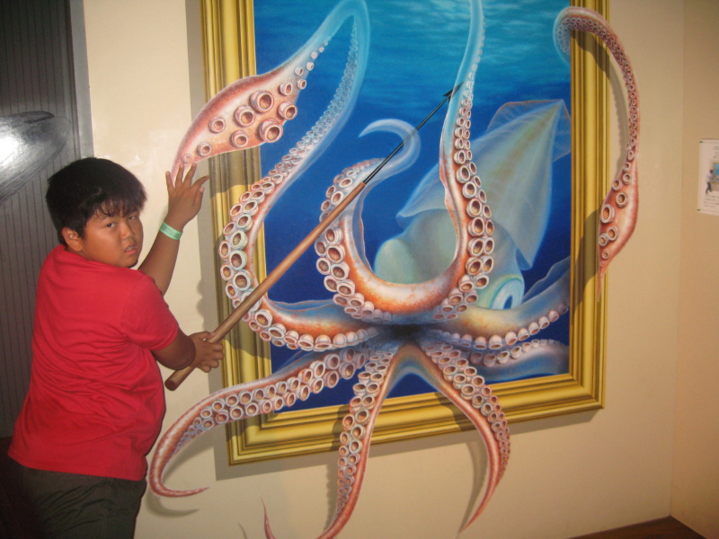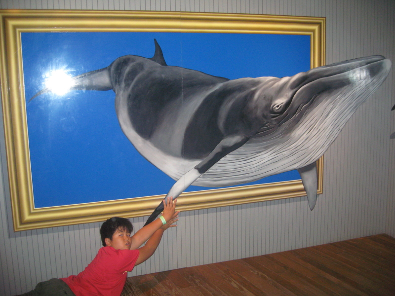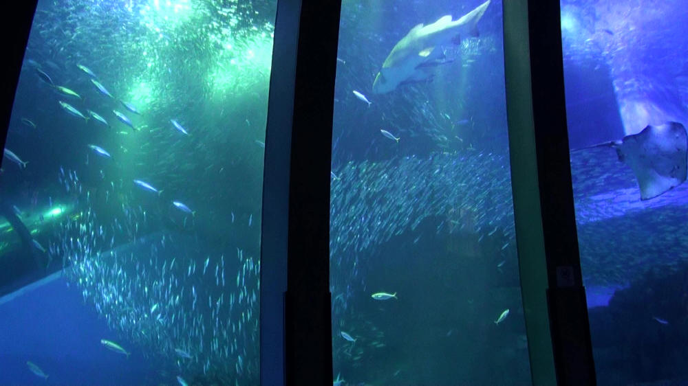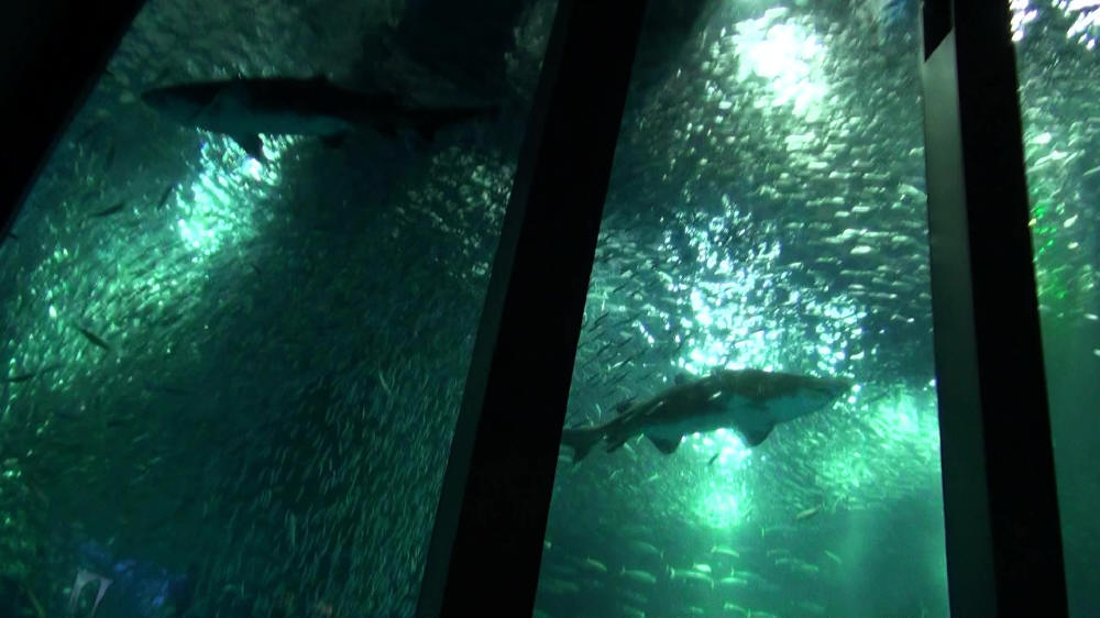 | 水槽の中ではエイ、サメ、小魚の群れが泳いでいた。突然、大きな体のセイウチが現れる。長い牙とギョロリとした目が怪物の様に見えた。 |