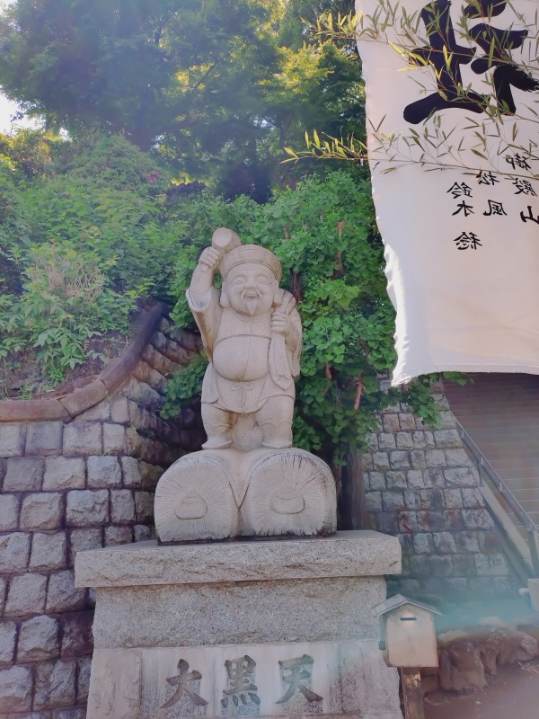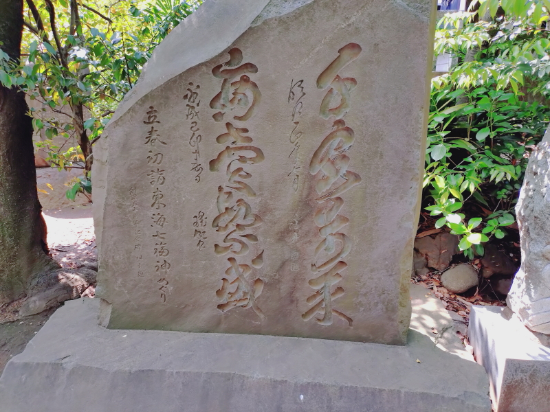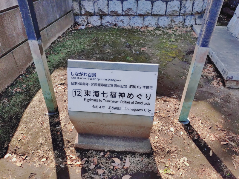 | 鳥居の左側には、「しながわ百景K東海七福神めぐり」の看板があり、その近くには大黒天の像がある。階段をあがった境内の右側には発祥の地碑「立春初詣/東海七福神めぐり発祥の碑/大いなる希望に歩め立春の碑/昭和二十六年西暦一九五一年」がある。「千客万来/〇・・・〇/商売繁盛/〇・・・〇/立春初詣東海七福神めぐり」と刻まれていると思われる七福神めぐり碑がある。 |