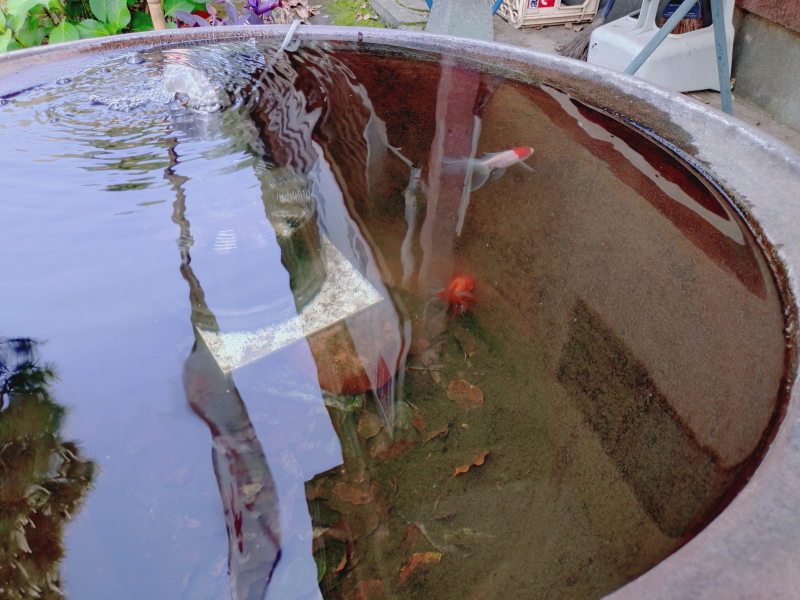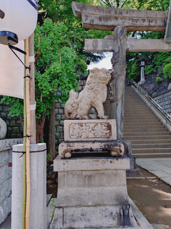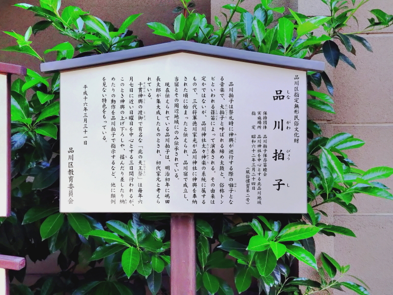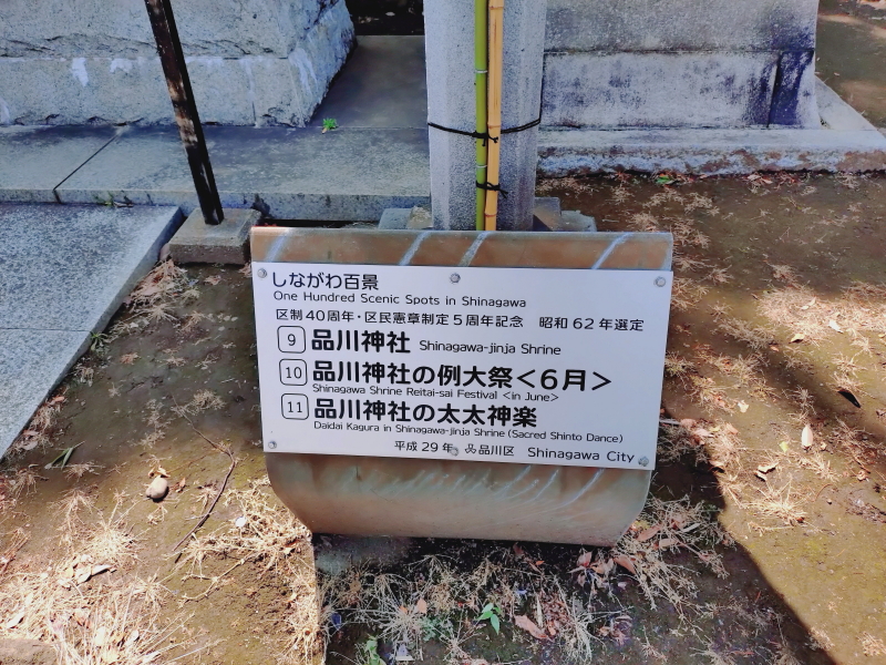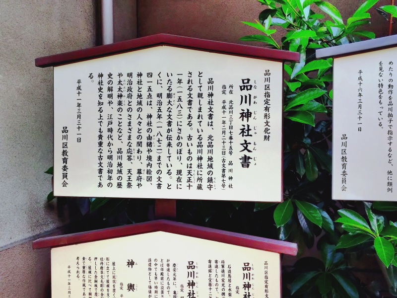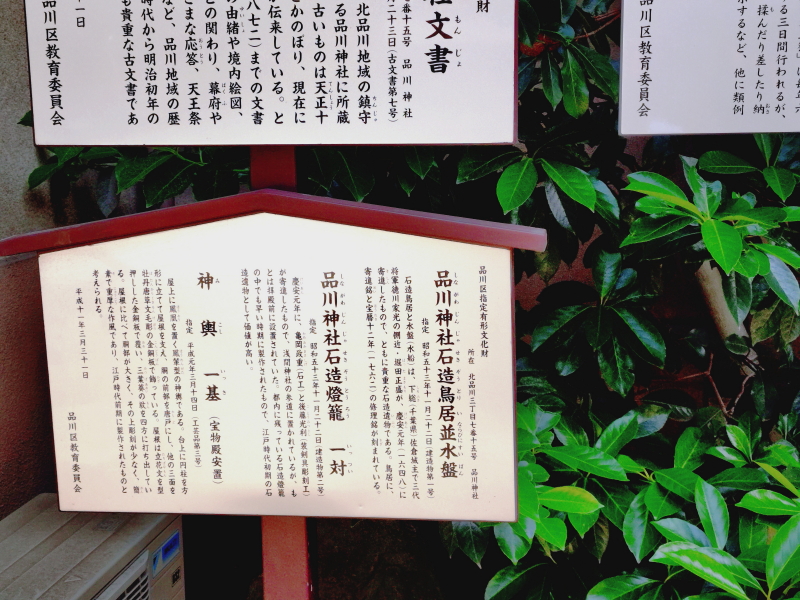 | 品川神社文書、品川拍子、石造鳥居並水盤、品川神社石造り灯龍、神輿などの解説板もある。水盤では金魚が泳いでいた。 |