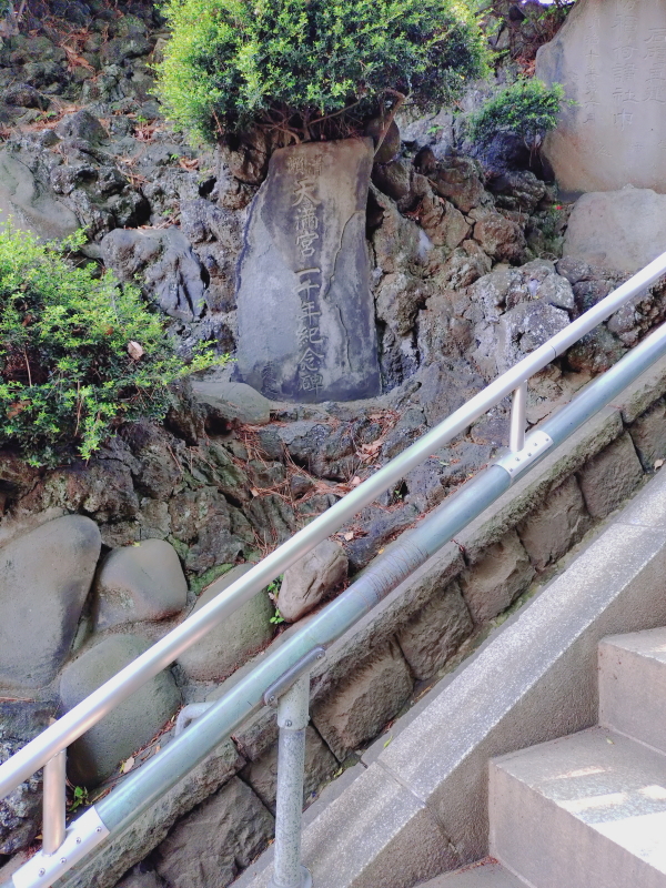 石段の途中に「清P/天満宮一千年紀念碑」がある。 石段再建の碑「石段(石亶)再建/火防稲荷講社中/明治十年第六月/嶺沖正脩謹書/世話人●●・・」や寄進の碑「石坂/再建/寄進/連名」が鎮座している。この碑は金5円から寄贈した名簿。 |