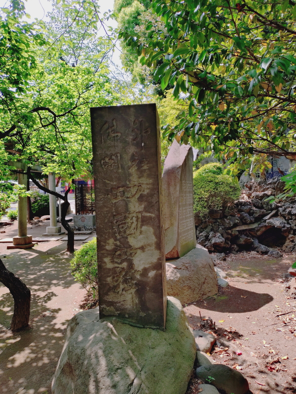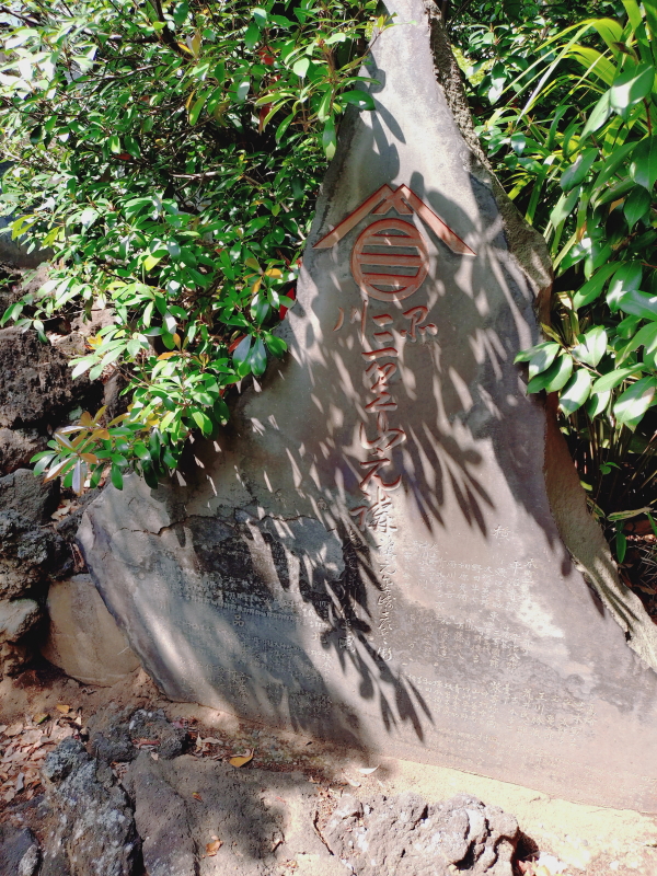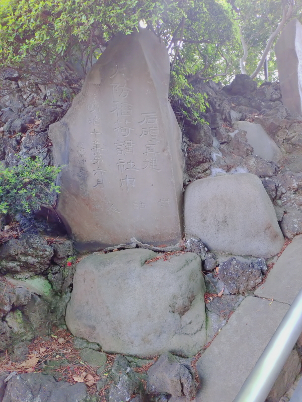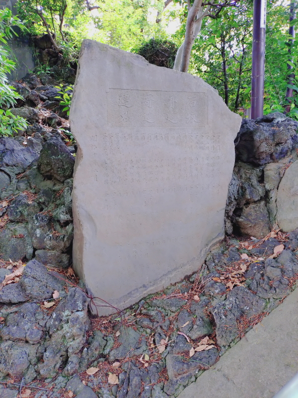 | 品川神社の双龍鳥居を潜って石段を上がって行くと、左側に足神様・猿田彦神社があり、そこが登山口になる。登山口から直ぐに1・2合目になり、右手の柵の中には「役小角と鬼」が鎮座している。 六合目からは急な自然石の石段を登って行く。7合目には2つの石碑が鎮座している。左は「寒緑松本先生出碑」、右は「人丸大明神碑」になる。寒緑松本先生出碑には幕末の漢学者の生い立ちが刻まれていると言う。人丸大明神とは柿本人麻呂のことらしい。碑文の大半は酸性雨で融けたのかのっぺらぼうになっていて解読できない。奇麗に咲いているつつじを眺める暇もなく山頂が見え出す。 |