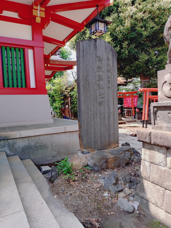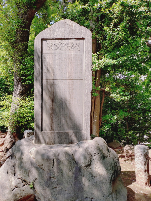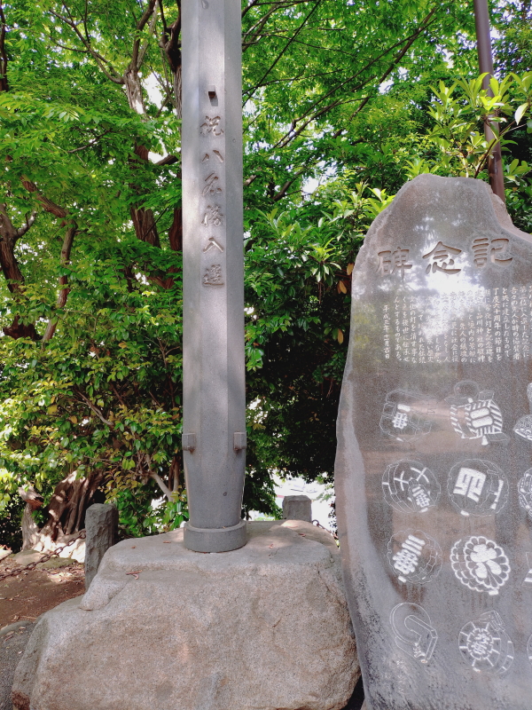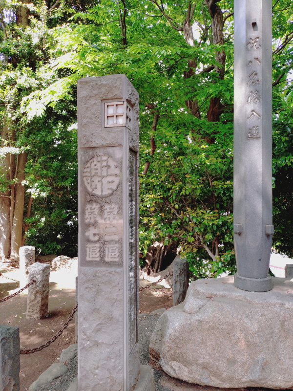 | 階段を上がると鳥居の奥に拝殿に見える広場になる。「祝八名勝入選」と「江戸消防/第二區/第七區」の石柱があり、その横に記念碑がある。碑文は石碑の全体を写したつもりが少し欠けていて最初の文書が分からない。 |