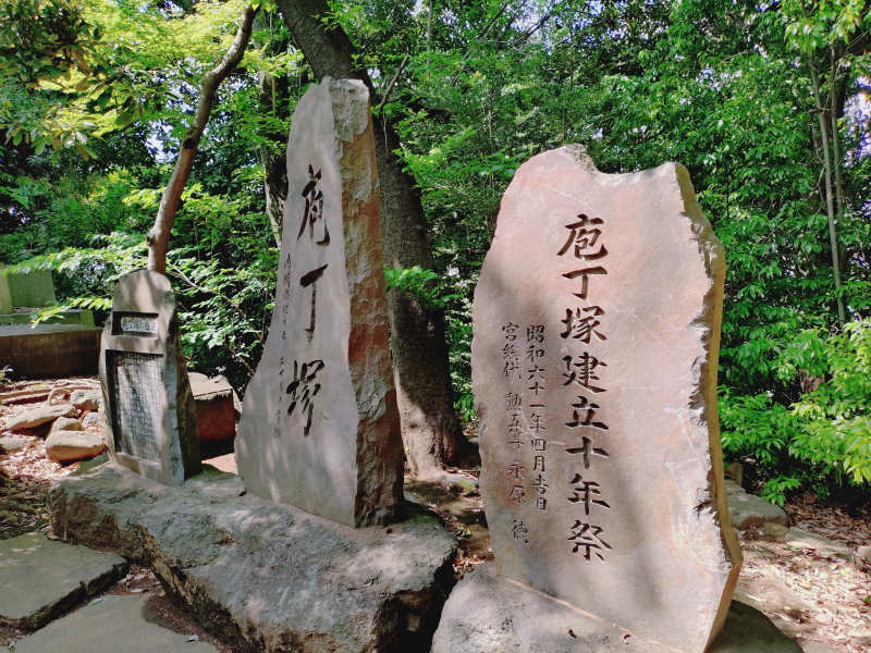 | 包丁塚は内閣総理大臣三木武夫書、その右には石碑「包丁塚建立十年祭/昭和六十一年四月吉日/宮総代勲五等永原徳」が傍にある。左手には包丁塚の由来碑がある。 |