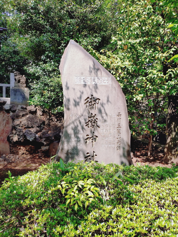 御嶽神社の境内には石柱があり、その正面に神社佛閣碑「四國四拜」側面が「天地開闢/大日本大社廻/応需 勝安芳〇〇」と刻まれている。碑陰には明治26年7月建立と刻まれている。品川三笠山元講の碑も鎮座している。 |