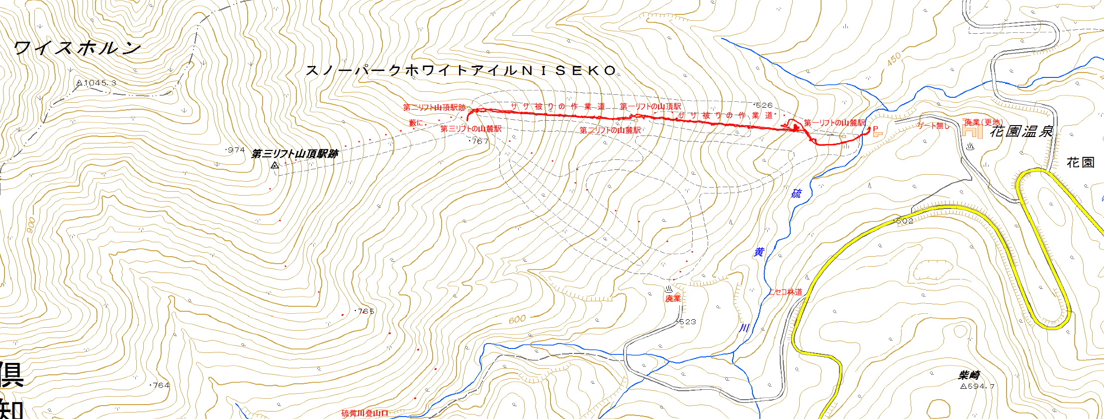 アクセス 倶知安ニセコ(道道58号)線で倶知安町からニセコに向かう途中に、ニセコワイス寶亭留 (2018年廃業)の看板があり右折する(2019年現在無し)。ニセコワイス寶亭留沿いの舗装切れに路駐し、雪上車スキー場のゲートを目指す(2015年7月3日現在はゲートが無くなり、車は下の広場まで入れる)。 国土地理院地図 Google マップ |