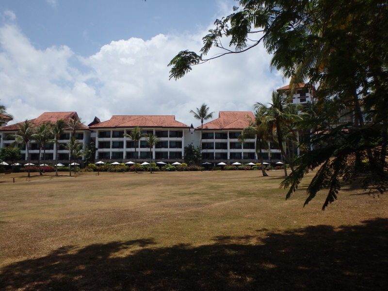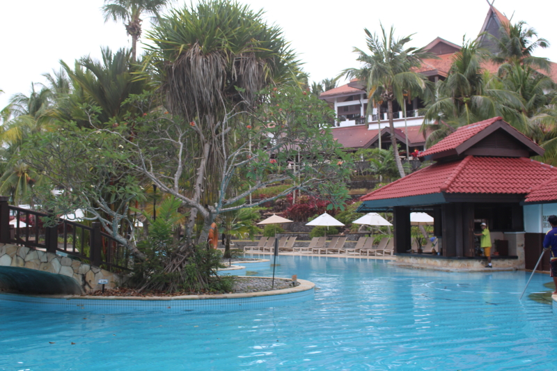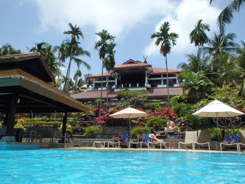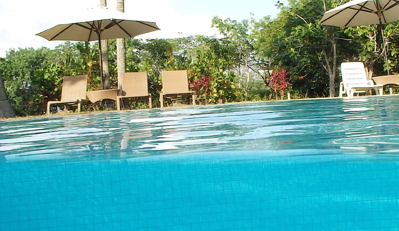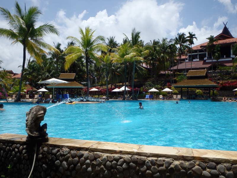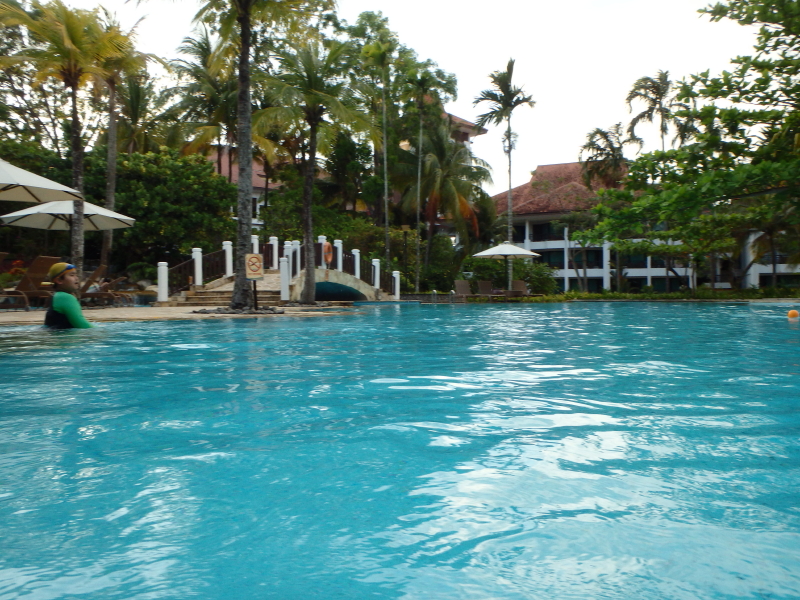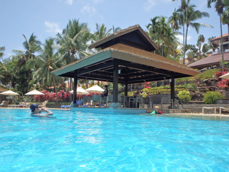 | プールサイドには東屋やパラソルが並んでいて、椰子の実にストローを刺して飲むジュースを飲んでいる人もいた。プールを振り向いて、シンガポールへと向かう準備をする。 |