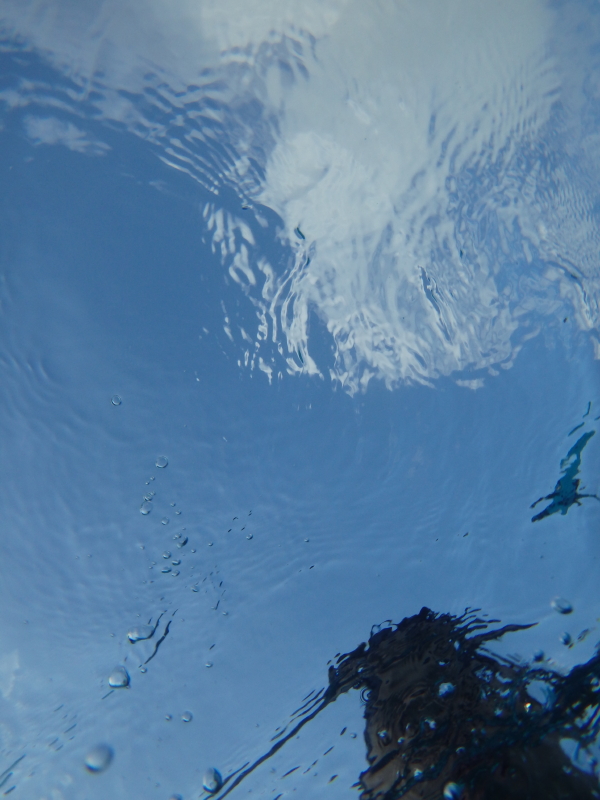 | 水の境界でプールサイドを写してみたり、水中から空を写してみたりする。ブリッジからは飛び込み禁止だった。ビーチボールで遊んでいるうちに暗くなってくるのでプールから上がる。 |