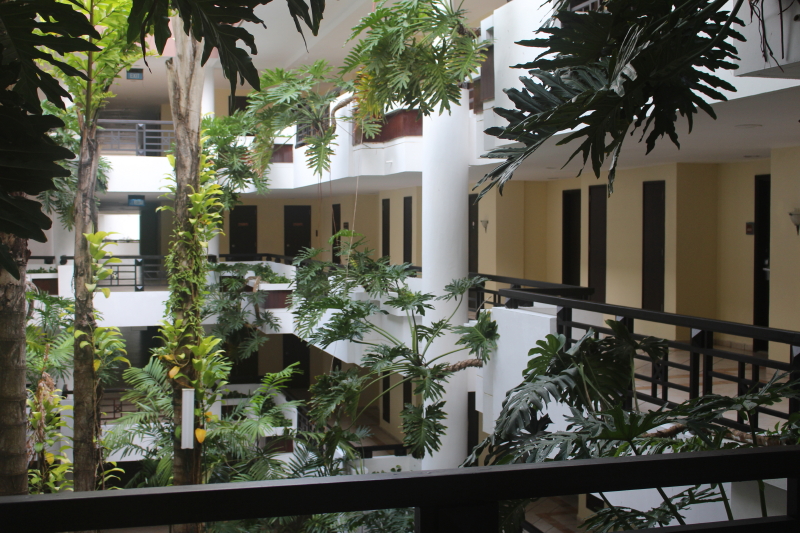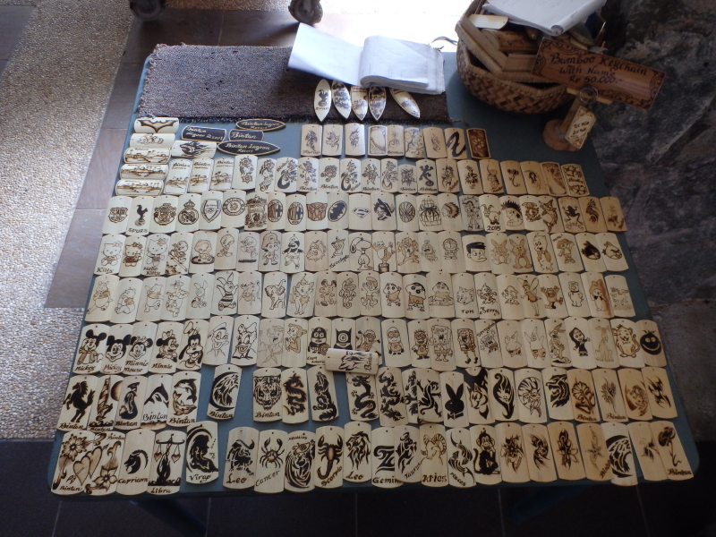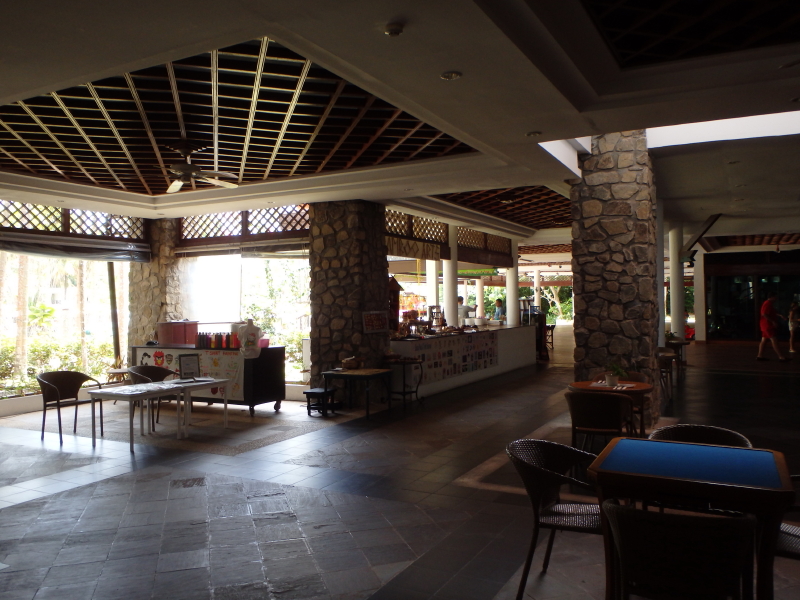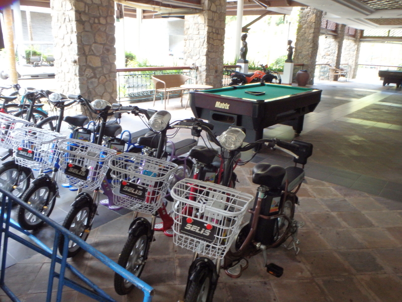 | 吹き抜けの廊下を歩いてロビーに行くと、竹細工が売られていた。ミッキーマウスやクレオンしんちゃんの絵柄もある。レンタルサイクル、麻雀の卓、手で操作するサッカーゲームもあった。 |