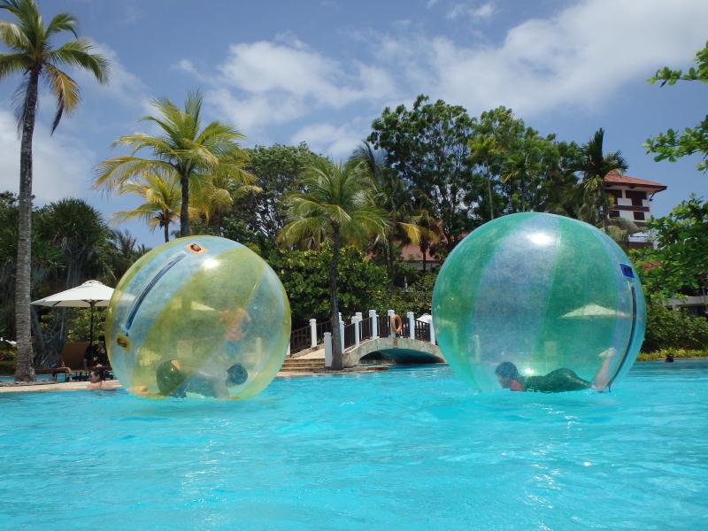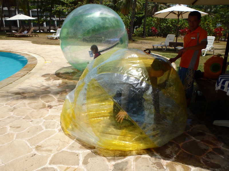 | 昼からプールに行きウォーターローラー(Water Roller)で遊ぶ。空気を入れた丸くなるまで待って、パンパンになったらプールに入る。意外と歩けずに、足をとられて転ぶ。 |