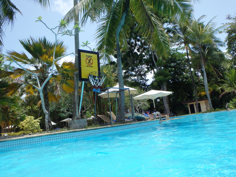 | プールサイドではコイの様な魚からマーライオンみたいに水を吐いていた。プールサイドから離れて海に行くとビーチバレーのネットが張られていた。水平線には海の交通の要衝らしく船舶がコブの様に連なっていた。対岸のシンガポールの陸地も見渡せる近さだった。 プールサイドに戻ると、バスケットゴールがあり「NO DUNKING/BY THE ORDER」と書かれた看板が添えられていた(「ダンク禁止(当局の指示により)」という意味)。 |