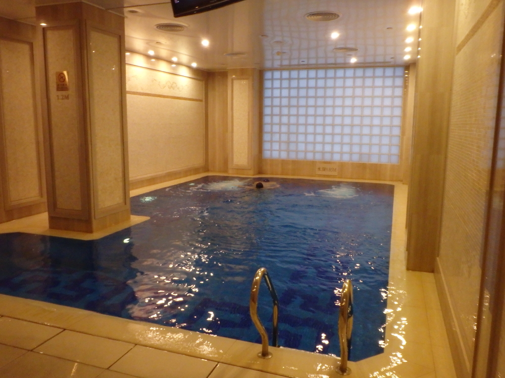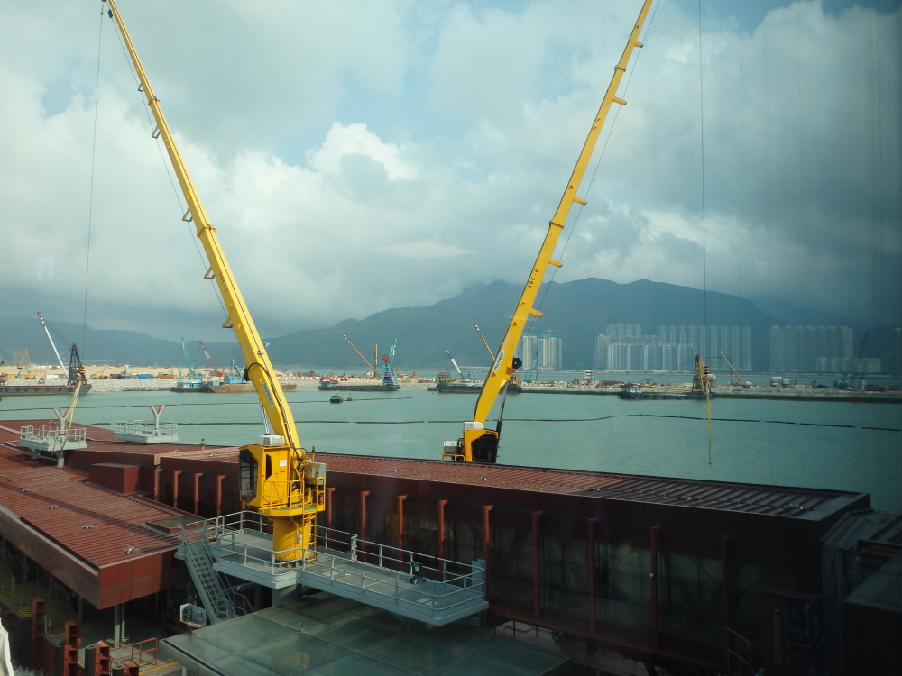 | 空港にはフェリーターミナル:海天客運碼頭(Skypier at Hong Kong International Airport)があり、国際線乗り継ぎ客のみ利用可能な高速艇が出発するとろだった。ターミナルの隣に荷物を乗せるのかクレーンも見られた。ホテルに着くと早速、金色のプールで泳ぐ。 |